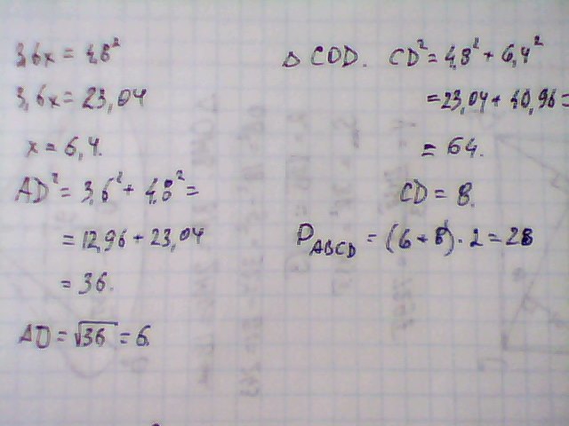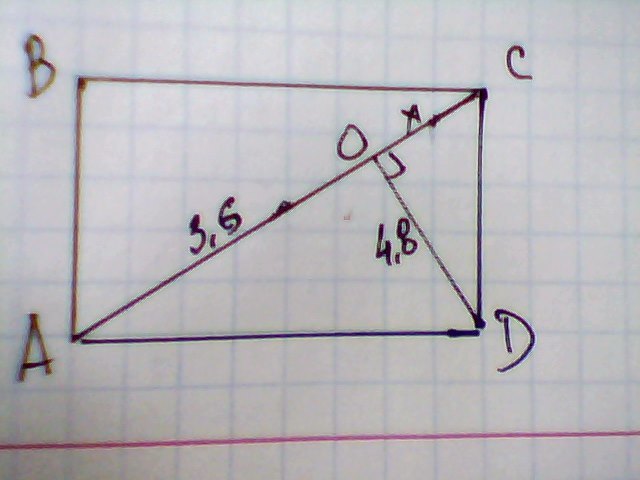 ABCD-прямоугольник ,OD -высота треугольника acd.Найдите периметр прямоугольника ,если DO 4,8см,AO 3,6см