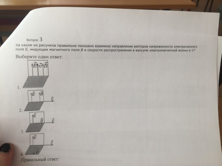 Ответ 4, гребни (в виде синусоиды) электромагнитной волны Е и магн.индукции В,расположены перпендикулярно друг к другу и движутся в направлении V, со скоростью света.