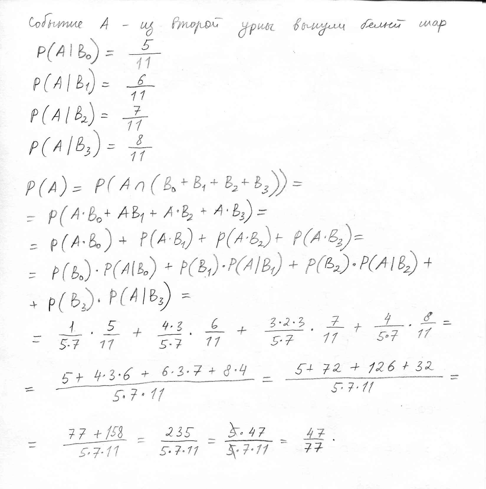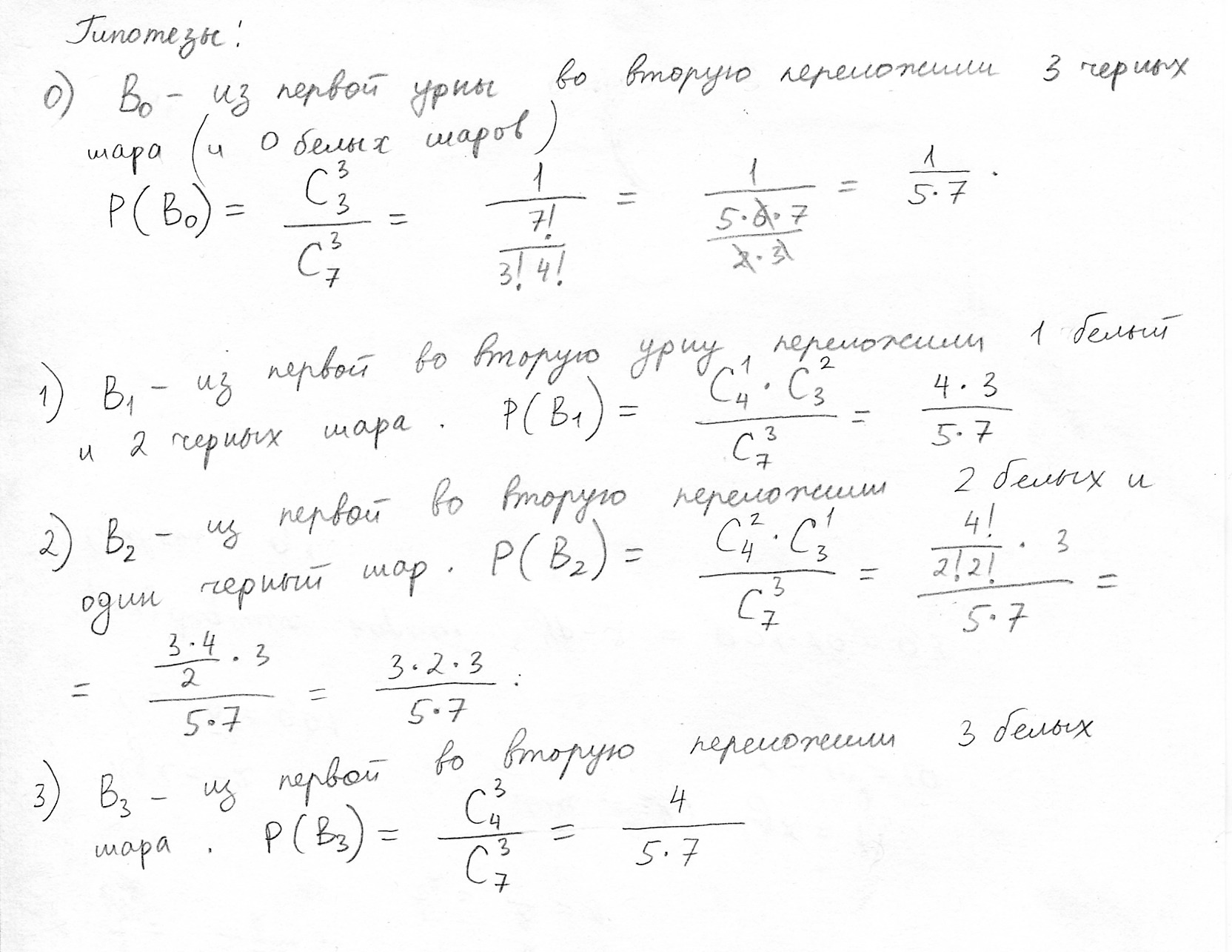 Из урны, содержавшей 4 белых и 3 чёрных шара, переложили три наудачу выбранных шара в урну, содержавшую 5 белых и 3 чёрных шара. Найти вероятность вынуть из второй урны белый шар.