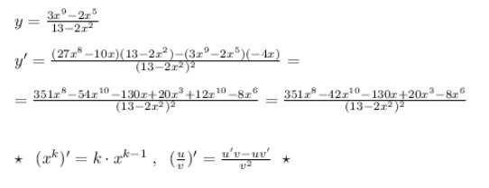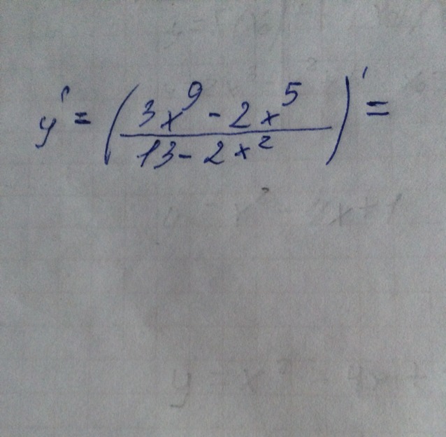 y'= [ (3*9x^8 - 2*5x^4)*(13-2x^2) -(3x^9-2x^5)*(-4x) ] / (13-2x^2)^2