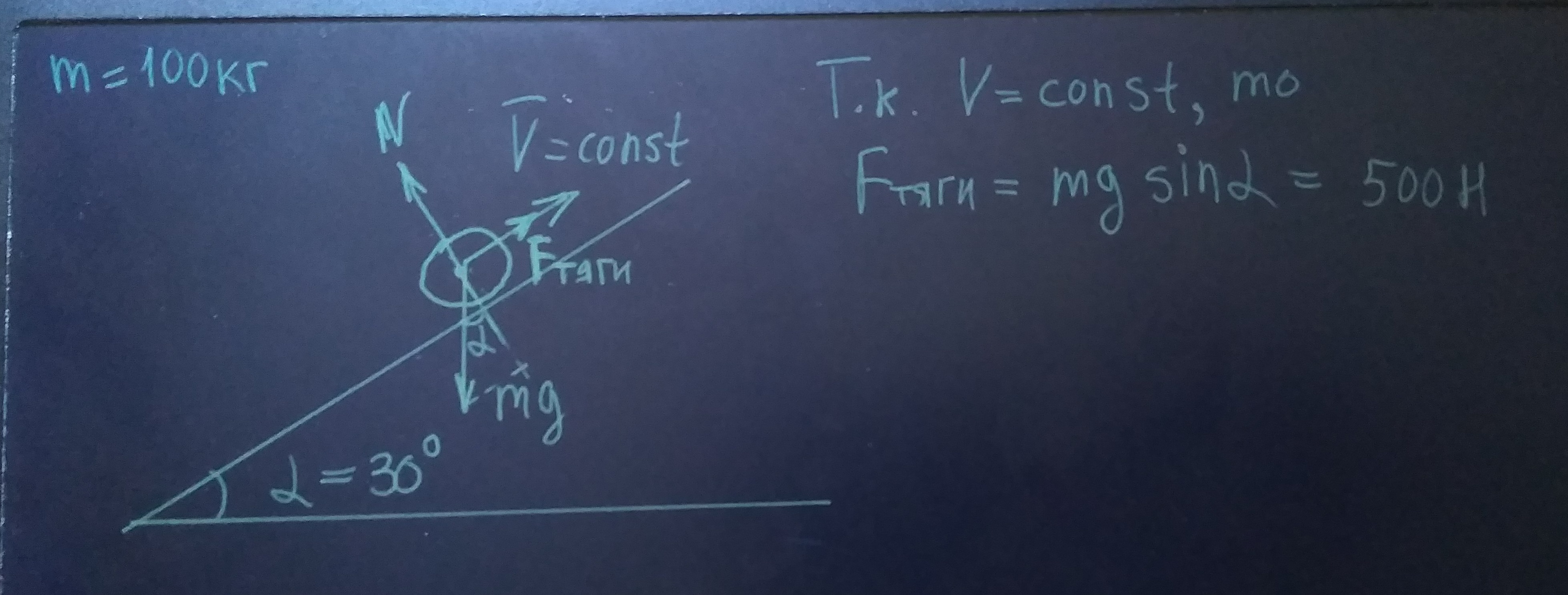 Вверх по склону, состовляещему 30 градусов с горизонтом, поднимается с постоянной скоростью мотоцикл массой 100 кг. Определить силу тяги, развиваемую мотором мотоцикла. Силу трения не учитывать.
