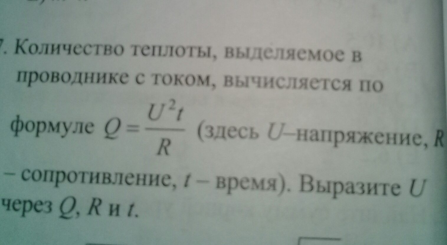 Q=frac{U^2t}{R} \\QR=U^2t\\U^2=frac{QR}{t}\\U=sqrt{frac{QR}{t}}