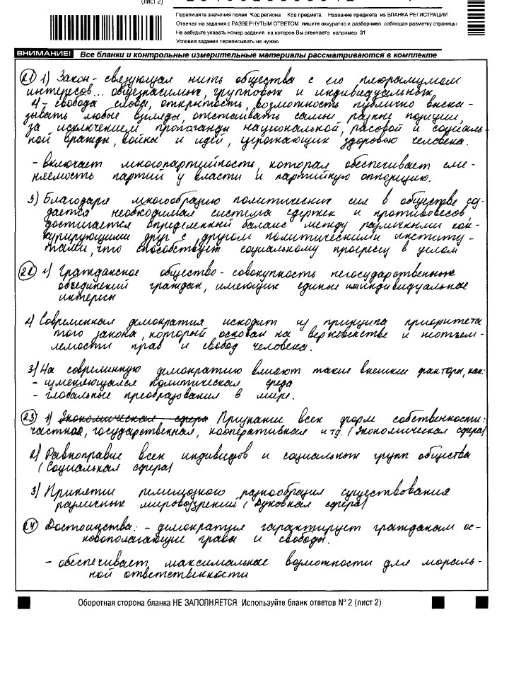 От вас, скорее всего, ожидают услышать что демократия гарантирует политические права и свободы граждан. Например, свободу слова и свободу совести. Можно написать про сменяемость власти и подотчетность власти обществу, однако рассуждения про моральную ответственность в данном вопросе неуместны.
