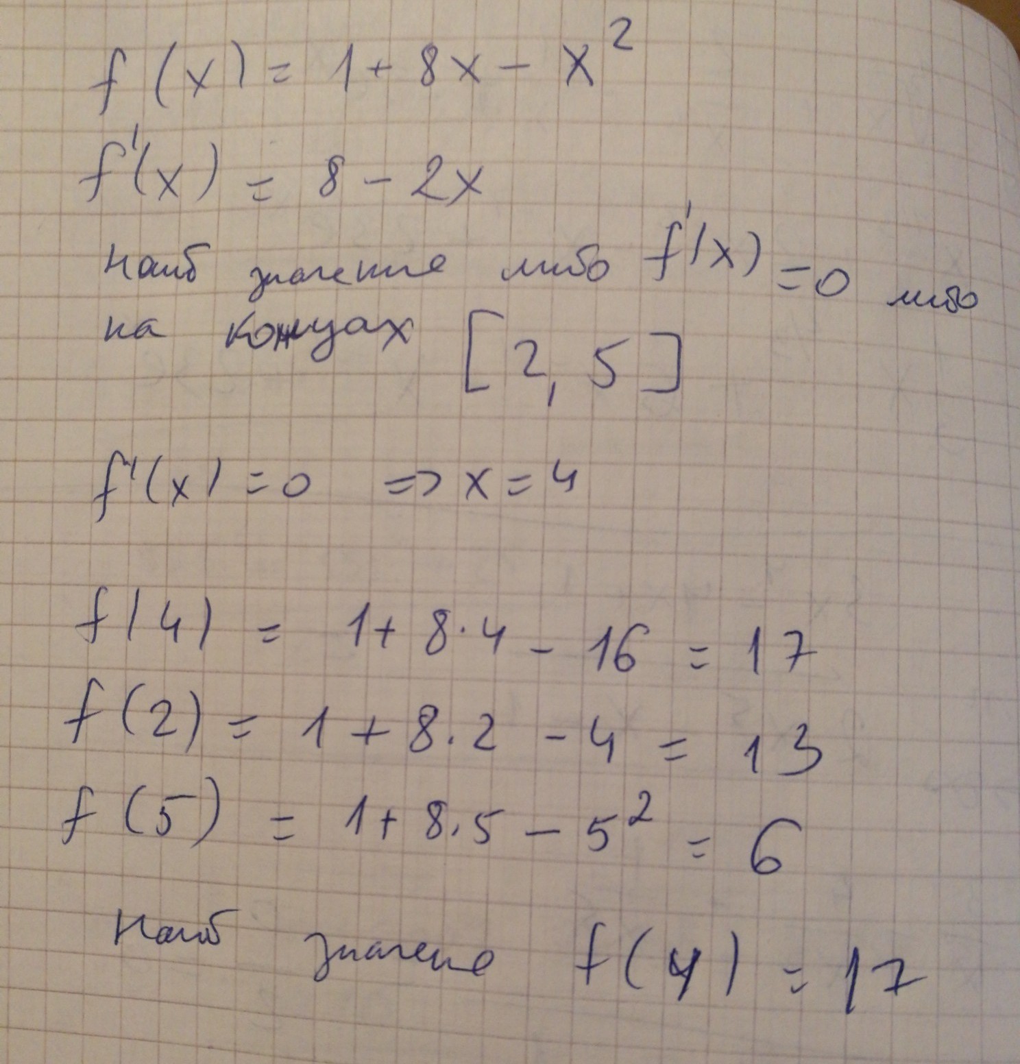 глупо -это писать подобное. Если предлагается найти экстремум на промежутке, то нужно найти, точки, где производная равна нулю , либо на концах интервала. учите математику, моя умница
