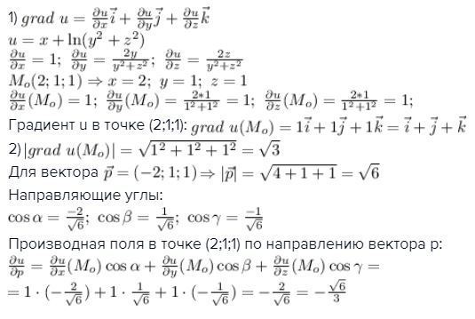 Производная поля в точке (2;1;1) по направлению вектора р: