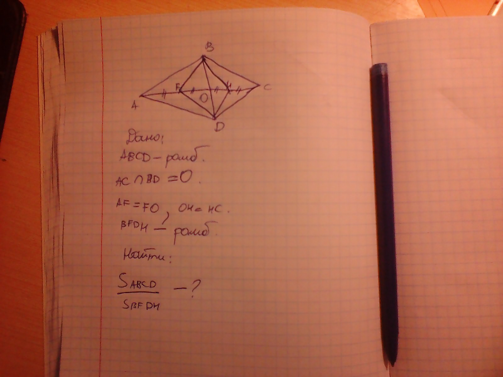 Sabcd =0,5*AC*BD ,Sbfdh=0,5*FH*BD ,FH=AC*0,5=>Sabcd/Sbfdh=2