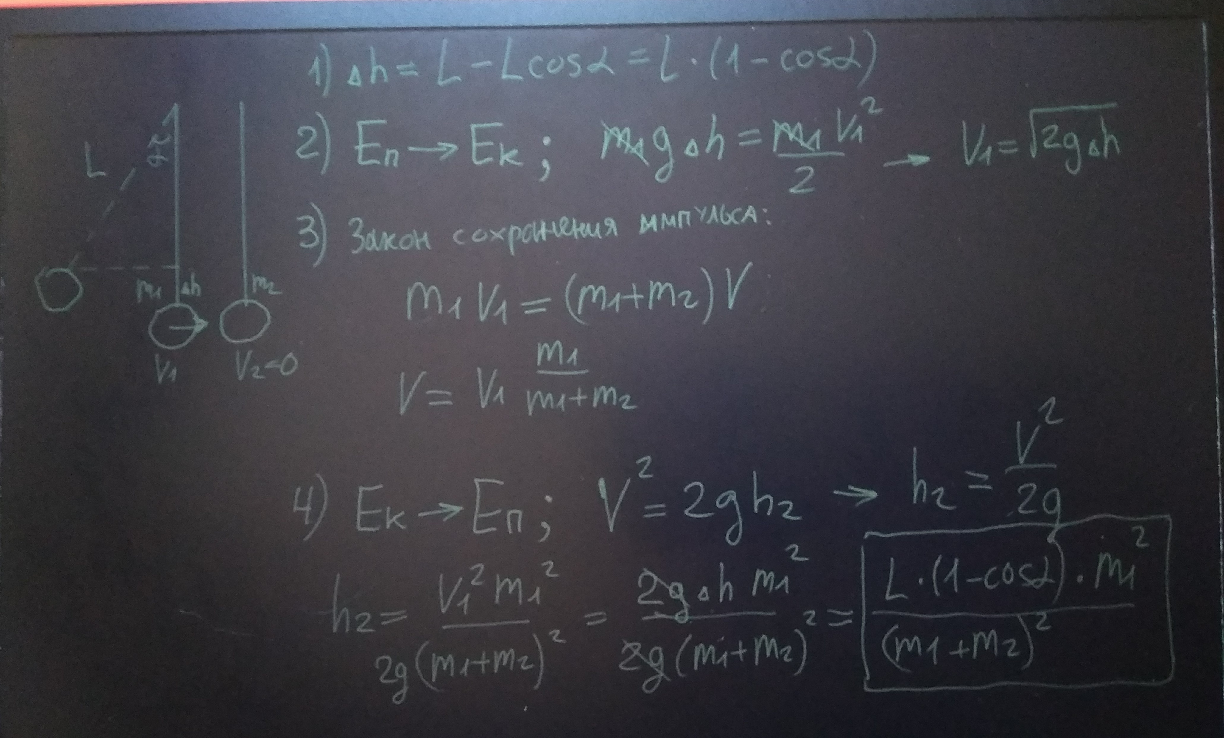 Два шарика , массы которых m1=200 г и m2=300 г , подвешены на одинаковых нитях длиной L=50 . шарики соприкасаются .Первый шарик отклонили от положения равновесия на угол и отпустили. на какую высоту после абсолнотно неупругого соударения поднимутся шарики ?