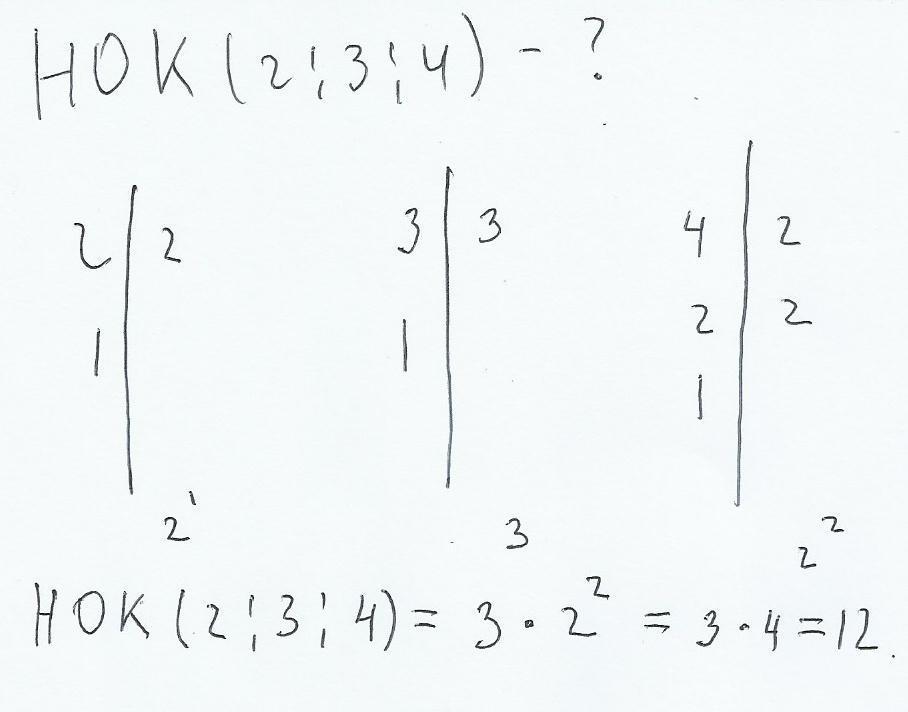 Итак, ищем НОК для чисел 3 и 4. 3 - простое число, 4 не делится на 3, а потому наименьшим общим кратным будет произведение этих чисел: НОК (2, 3, 4) = 3·4 = 12