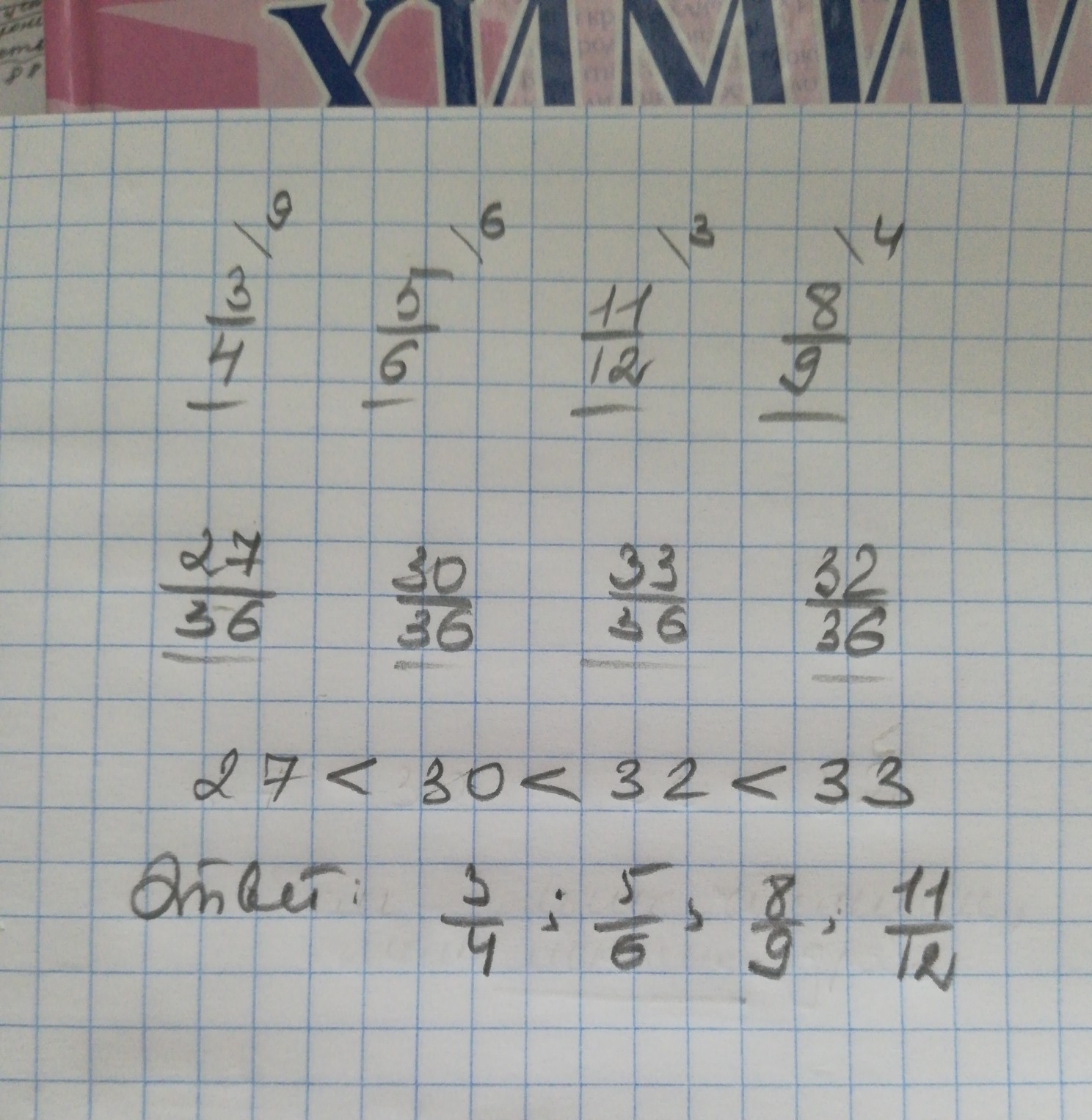 все это запишем и внимательно посмотрим. меньше будет та дробь, числитель которой тоже меньше. в нашем случае получится 27/36, 30/36, 32/36, 33/36, а точнее, как просили в условии 3/4, 5/6, 8/9, 11/12