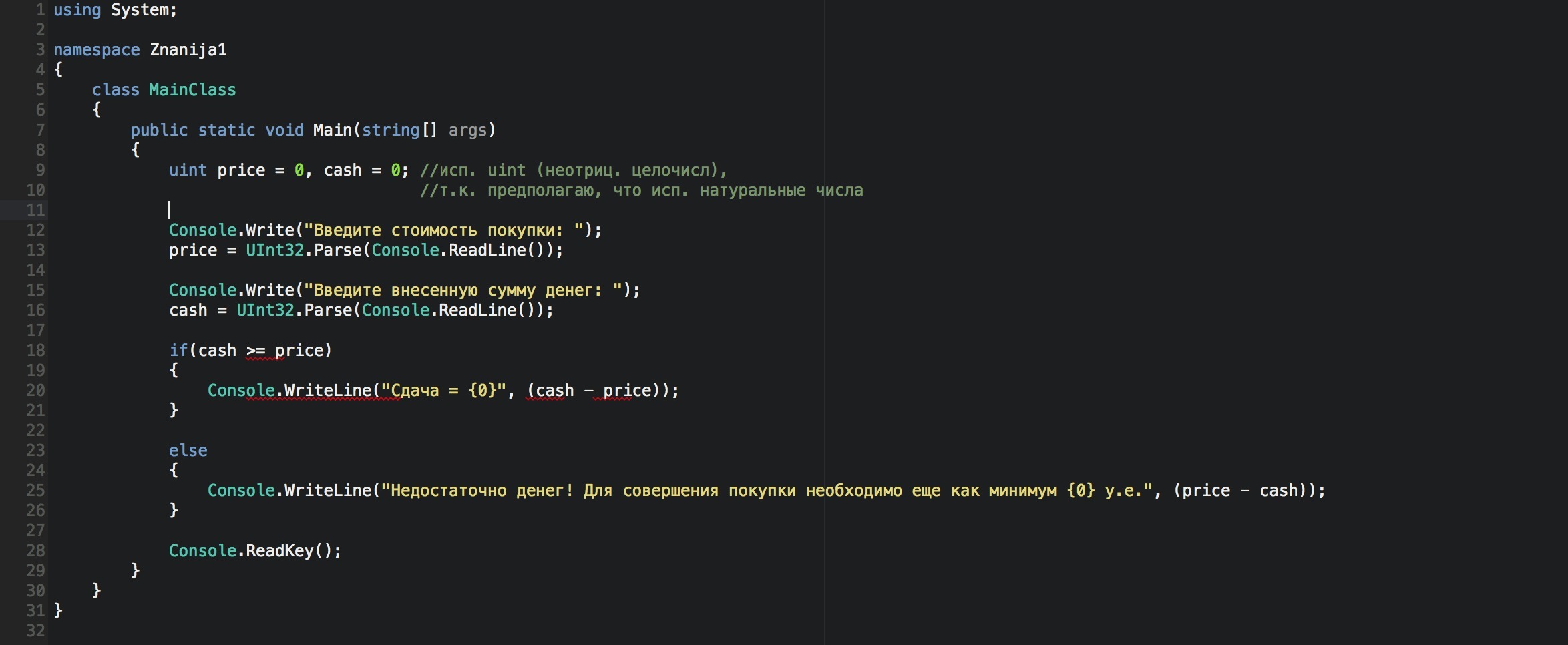 Написать программу на языке С#, определяющую достаточно ли денег для совершения покупки. Если денег достаточно, вывести на экран сообщение о количестве сдачи, если не достаточно, вывести на экран соответствующее сообщение. Пример работы программы: Введите стоимость покупки: 170 Введите внесенную сумму денег: 200 Сдача составляет 30