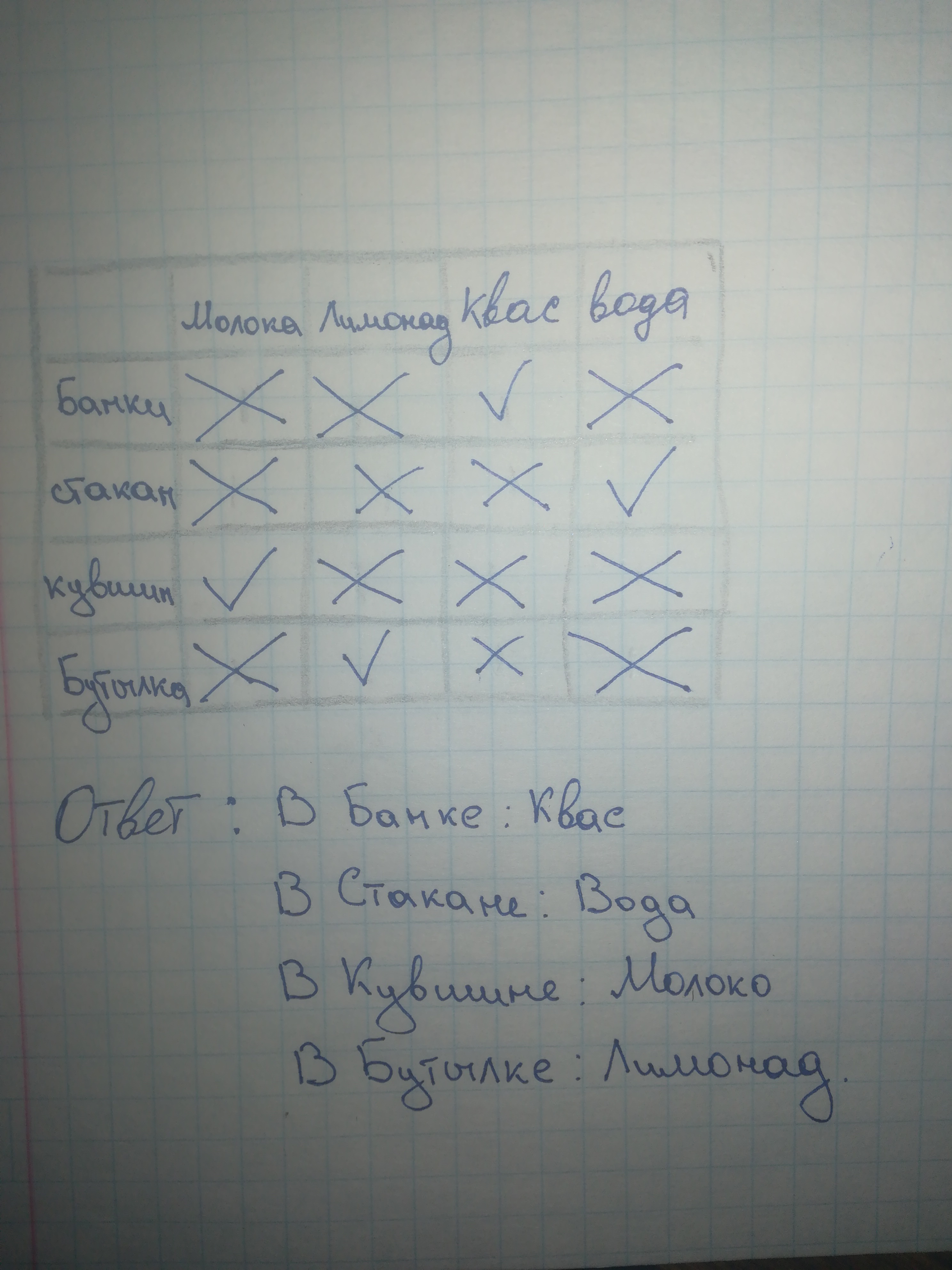 В условии сказано, что в Бутылке не может быть Молока и Воды, так же в условии написано, что Лимонад и Квас стоит рядом с Кувшином, значит в Кувшине их не может быть. В условии написано так же, что в Банке не может быть Кваса и Лимонада,так же написано, что в Банке не Лимонад и не Вода, так же сосуд с Молоком стоит около Стакана и Банки, значит Молока там не может быть. Значит в Кувшине Молоко, для Воды остаётся только Стакан, для Лимонада только Бутылка осталась, а для Кваса Банка