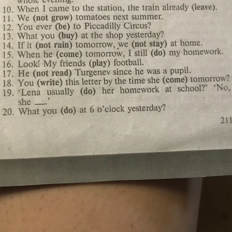 19.Does Lena usually do her homework at school?No,she doesn't.