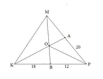 биссектрисы KA MB треугольника KMP пересекаются в точке O. Определить отношение KO к OA если AP=20 BP=12 BK=18