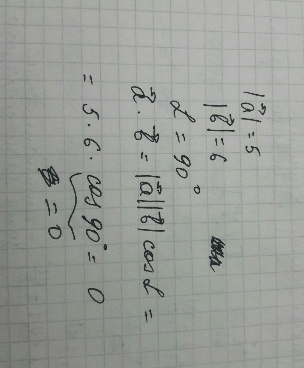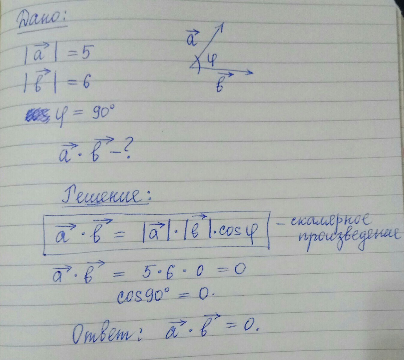 задача на память. Модуль вектор а = 5, модуль вектор b =6. Найти их сколярное произведение и у них там что то под 90 градусов. :) Хотя бы примерное решение этой задачи напишите пожалуйста