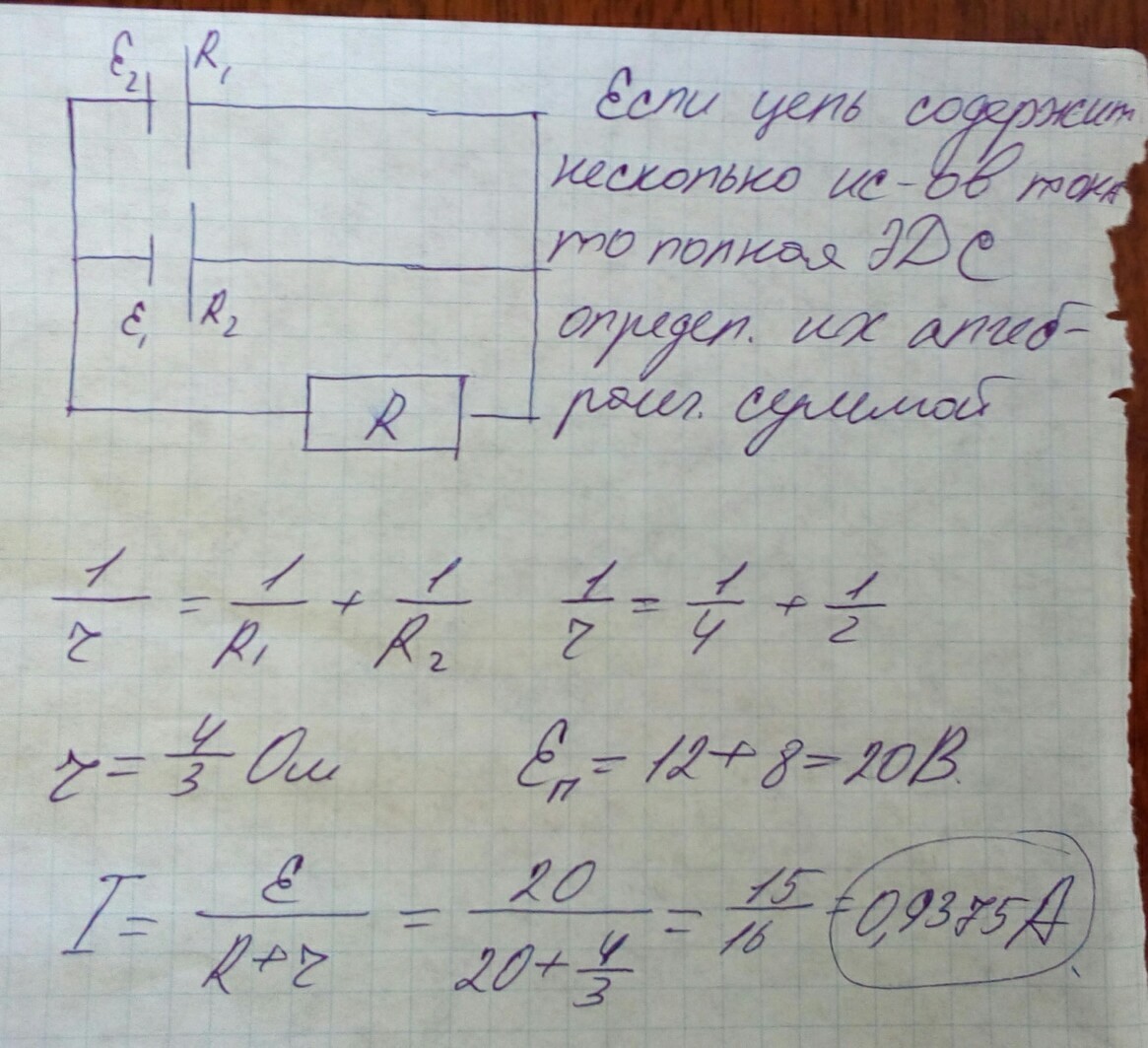Два источника тока с ЭДС Е1 = 12 В, Е2 = 8 В и внутренними сопротивлениями r1 = 4 Ом и r2 = 2 Ом, а также проводник сопротивлением R=20 Ом соединены, как на рисунке. Определить силу тока в реостате и источника тока. (можно плиз более подробно)