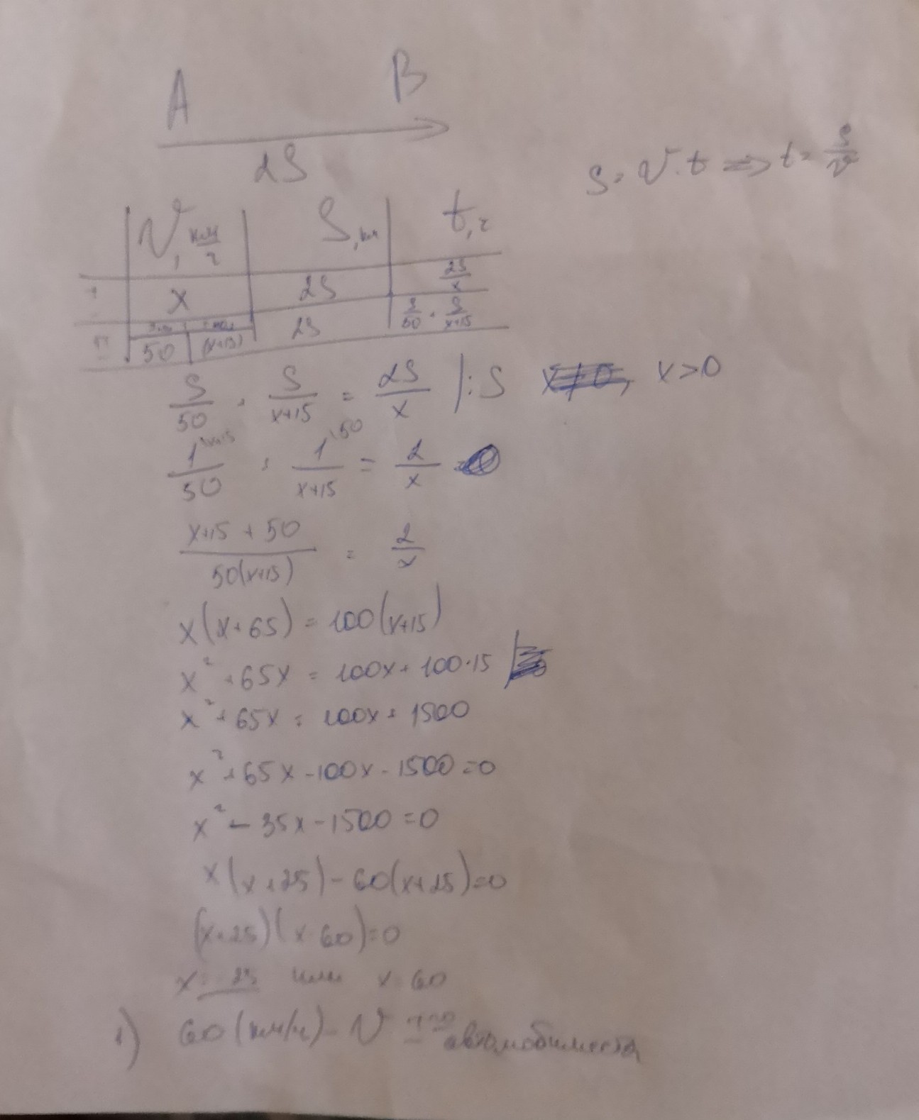 Из пункта A в пункт B одновременно выехали два автомобиля. Первый проехал с постоянной скоростью весь путь. Второй проехал первую половину пути со скоростью 50км/ч, а вторую половину пути-со скоростью, на 15 км/ч большей скорости первого, в результате чего прибыл в B одновременно с первым автомобилем. Найдите скорость первого автомобиля. Ответ дайте в км/ч.