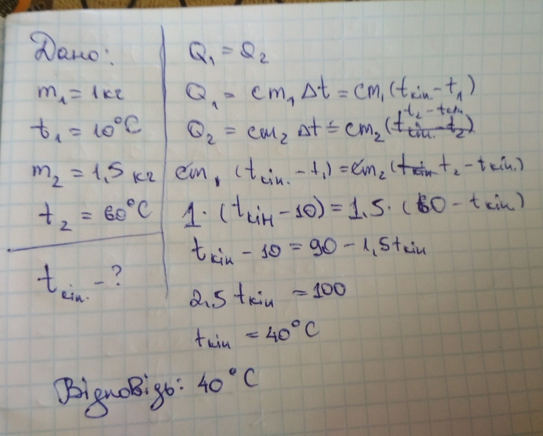 У посудину, де перебувало 1кг води при температурі 100 С, влили 1,5кг води при температурі 600 С. Яка температура встановилася в посудині? Теплоємністю посудини і теплообміном між посудиною та навколишнім середовищем знехтувати.