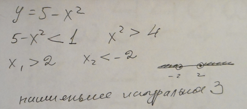 Найдите наименьшее натуральное значение х,при котором график функции y=5-x^2 проходит ниже прямой y=1 (c пояснением)