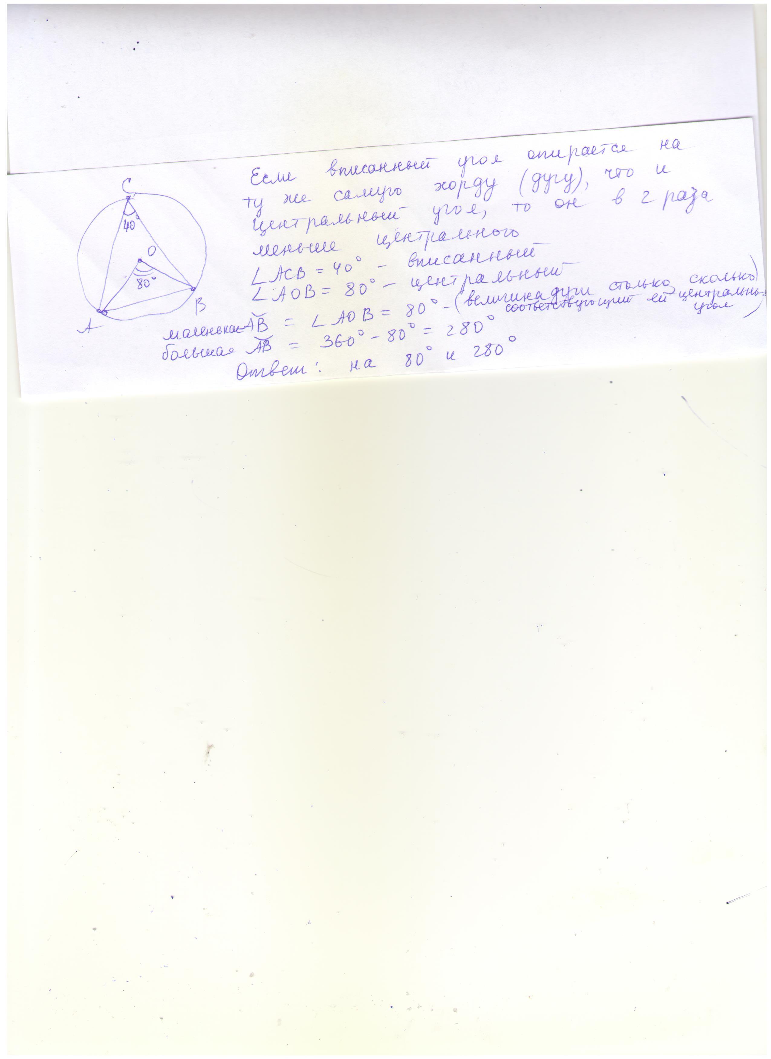 Хорда AB окружности видна из любой точки одной из дуг, на которые делит хорда окружность, под углом 40° . Чему равны дуги, на которые точки A и B разделили окружность?