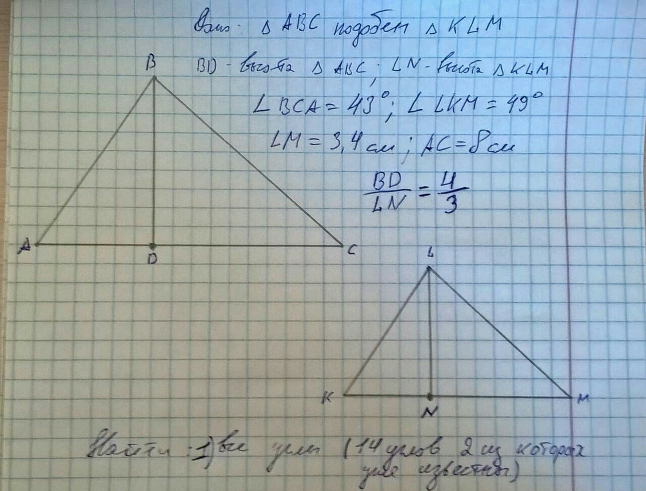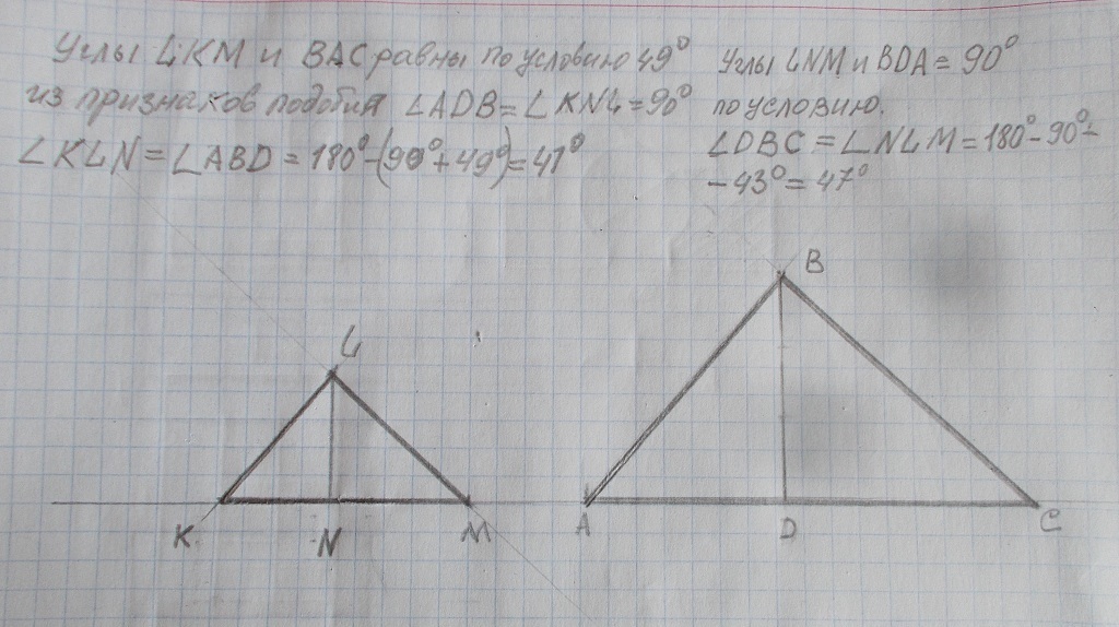 ∠ LNM = ∠ BDA = 90° по условию, образованы высотой и основанием. ∠DBC = ∠NLM = 180° - (90° + 43°) = 47°. ∠LKM = ∠BAC = 49° по условию по признаку подобия треугольников. ∠ADB = ∠KNL = 90°, так как образованы высотой и основанием. ∠ KLN = ∠ABD = 180° - (90° + 49°) = 41°.