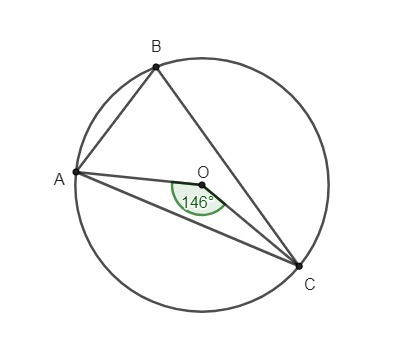 Точка B кола і точка O - центр цього кола - лежать по один бік від хорди AC. Знайти кут ABC , якщо кут AOC = 146°.