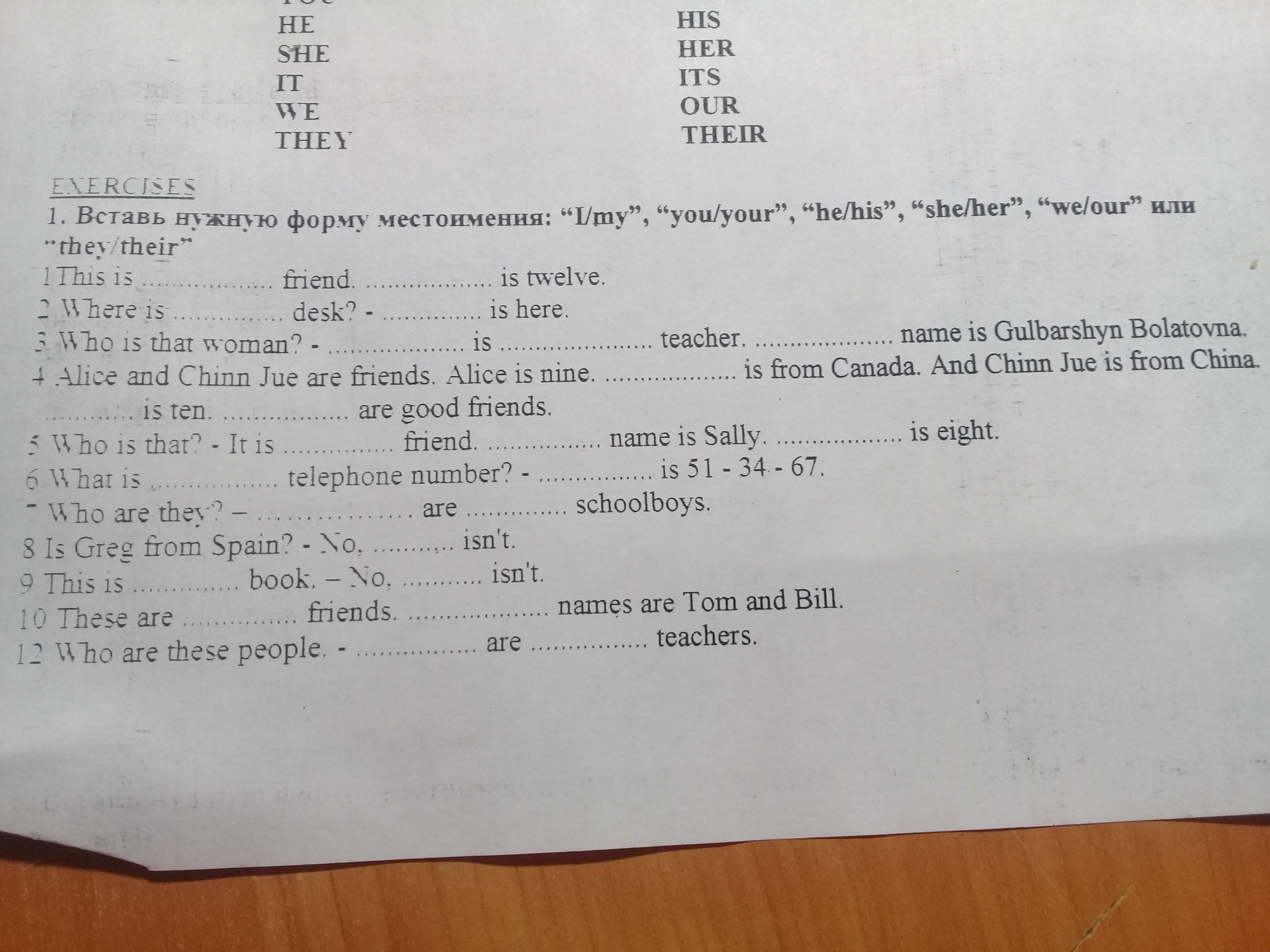 This is.....friend.......is twelve. Where is......desk?-..... is here. Who is that woman?-.... is......teacher........name is Gulbarshyn Bolatovna. Alice and Chinn Jue are friends. Alice is nine. ........is from Canada. And Chinn Jue is from China. .......is ten. ......are good friends. Who is that?- it is.....friend. ......name is Sally. ......is eight. What is ......telephone number?- .......is 51-34-67. Who are they?-........are.......schoolboys. is Greg from Spain?- No,.........isn't. This is........book.- no, isn't. These are.......friends. ........names are Tom and Bill. Who are......these people. - .......are ...........teachers.