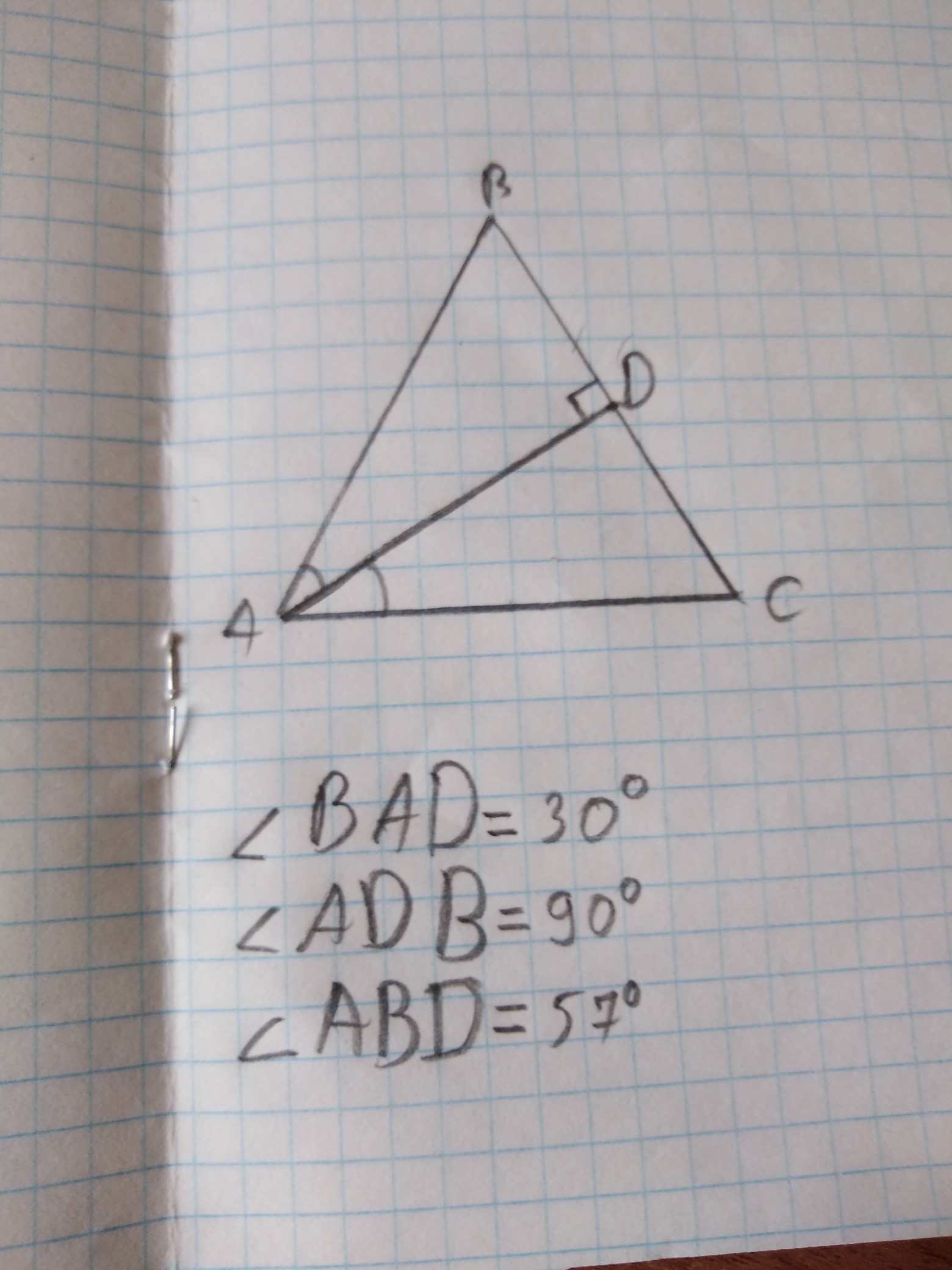 То есть делит угол A пополам => угол BAD = 1/2 угла A = 1/2 * 60 = 30°