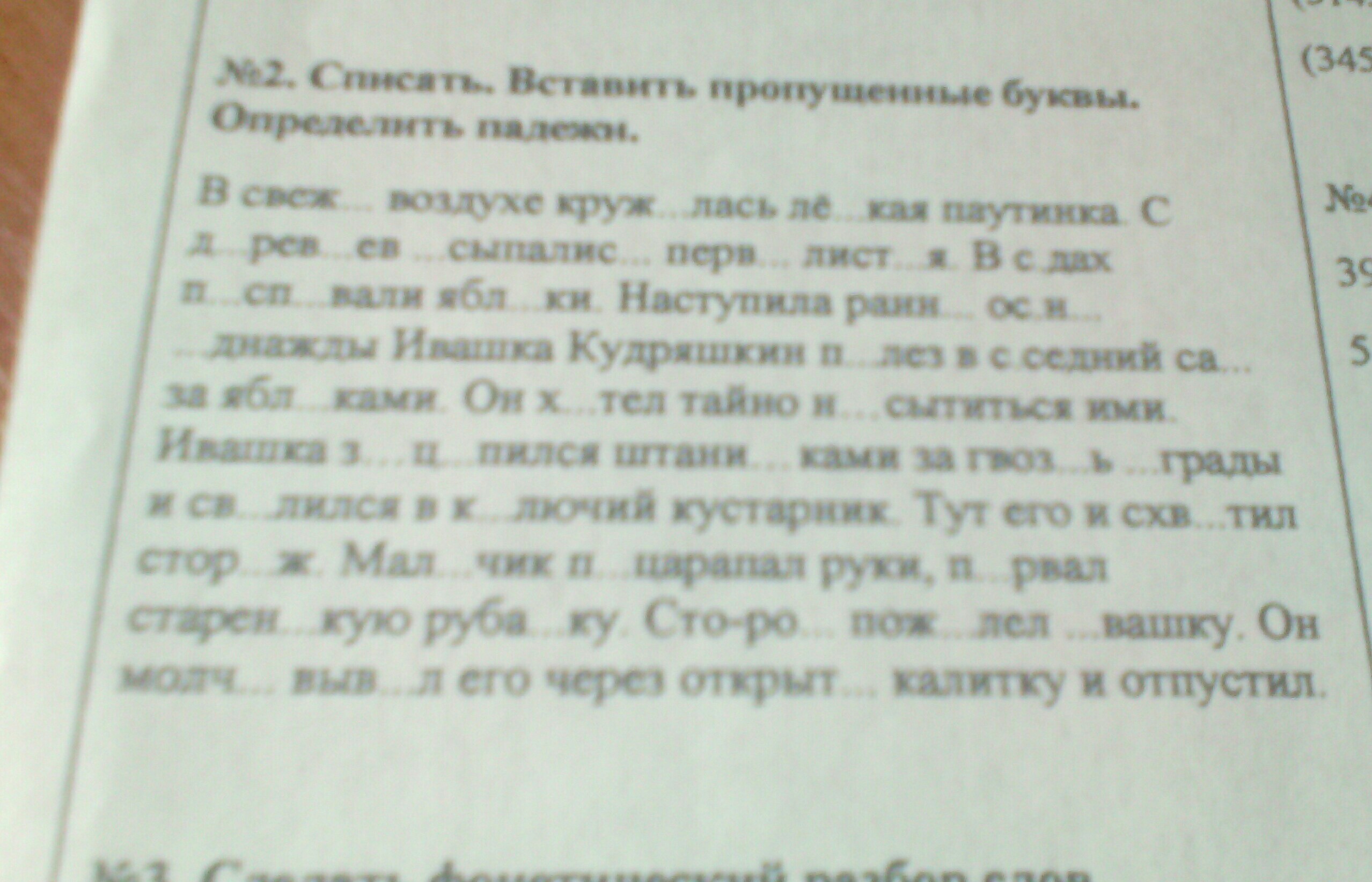Однажды Ивашка (им.п.) Кудряшкин (им.п.) полез в соседний сад (вин.п.) за яблоками (твор.п). Он хотел тайно насытиться ими. Ивашка (им.п.) зацепился штанишками (творит.п.) за гвоздь (вин.п.) ограды (род.п.) и свалился в колючий кустарник (вин.п.). Тут его и схватил сторож (им.п.). Мальчик (им.п.) поцарапал руки (вин.п.), порвал старенькую рубашку (вин.п.), Сторож пожалел Ивашку (вин.п.). Он молча вывел его через открытую калитку (вин.п.) и отпустил.