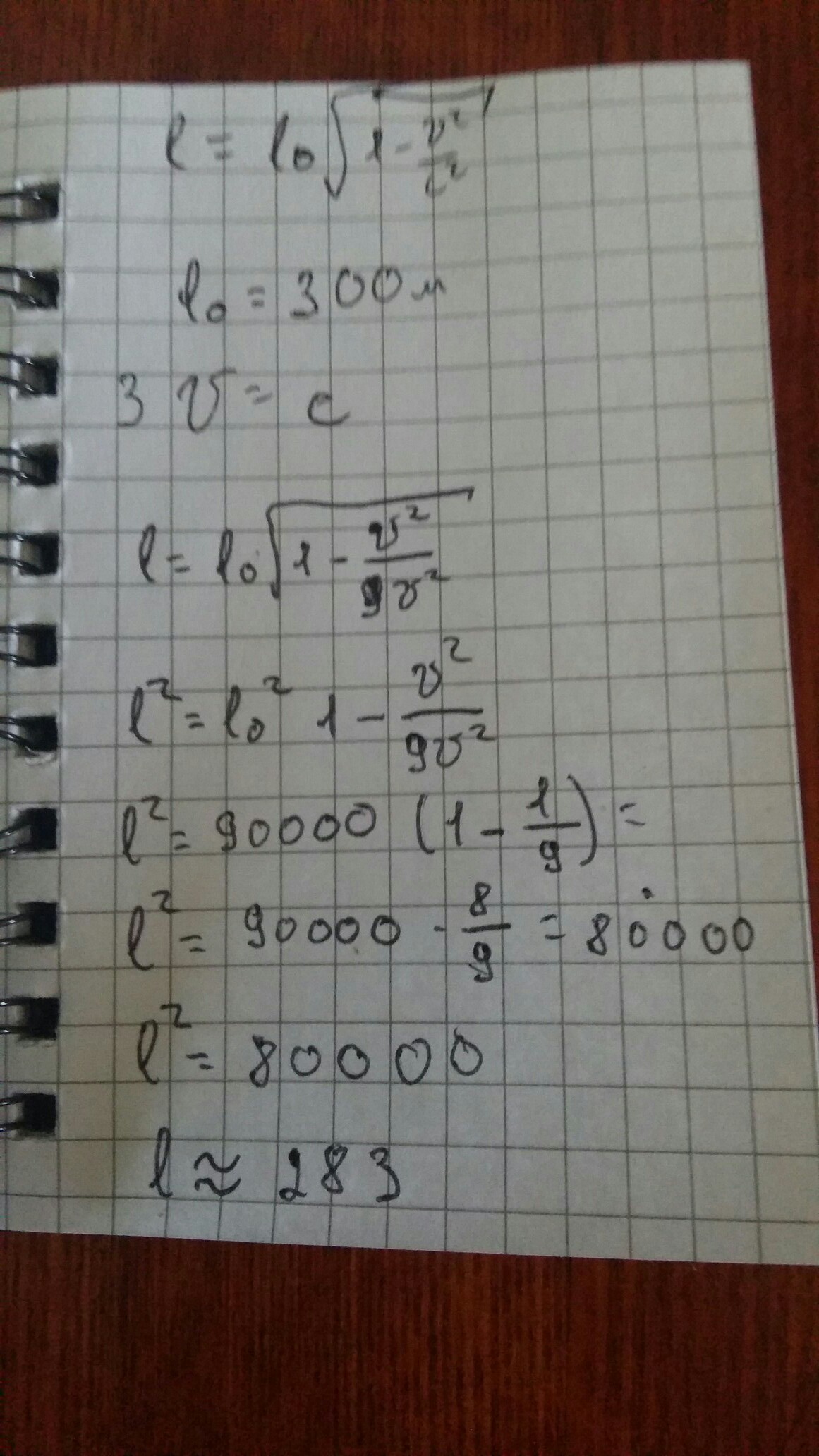 Неподвижная ракета на земле имела длину L - 300 м . При скорости ракеты , в 3 раза меньшей скорости света , зрения наблюдателя , оставшегося на Земле ее длина будет