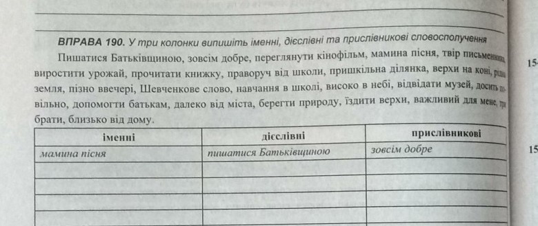 Іменникові: твір письменника; пришкільна ділянка; рідна земля; Шевченкове слово; навчання в школі; важливий для мене; три брати