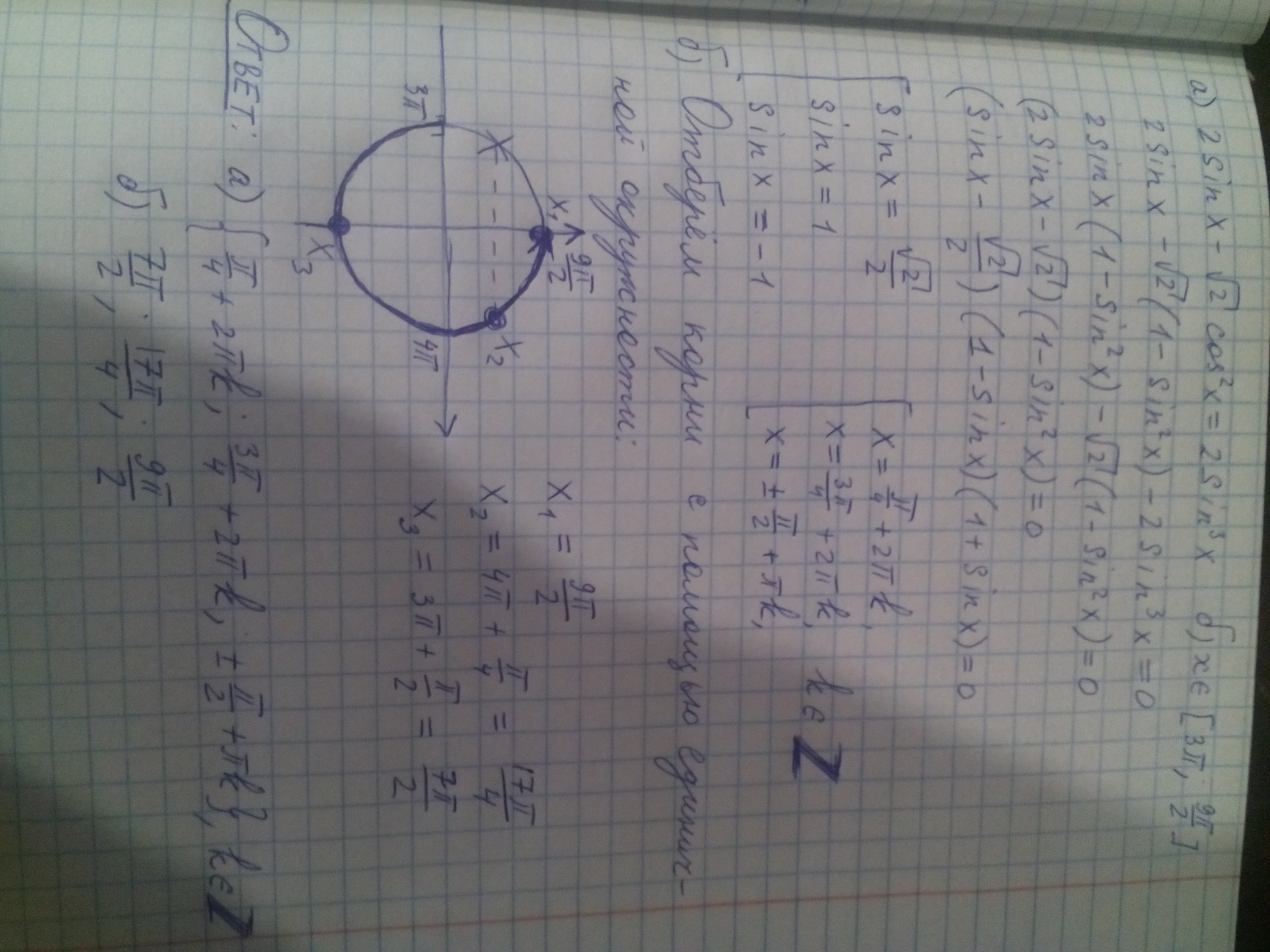 а) 2sinx-(корень из 2) cos в квадрате x равно 2 sin в кубе x