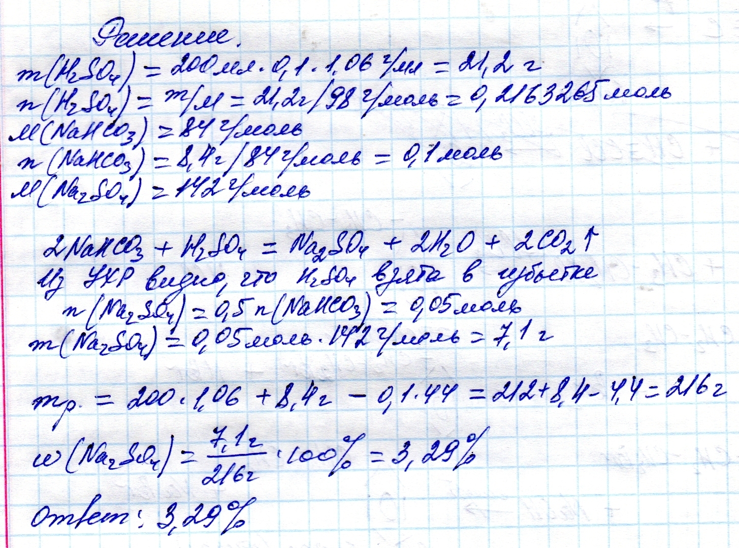 В 200 мл 10%-ной серной кислоты (плотность 1,06 г/мл) растворили 8,4г. гидрокарбоната натрия. Вычислите массовую долю сульфата натрия в полученном растворе.