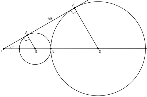 две окружности касаются внешним образом.их общие касательные наклонены к линии центров под углом 30 град.,длинна отрезка касательной между точками касания 108 см.Найти радиусы окружностей.