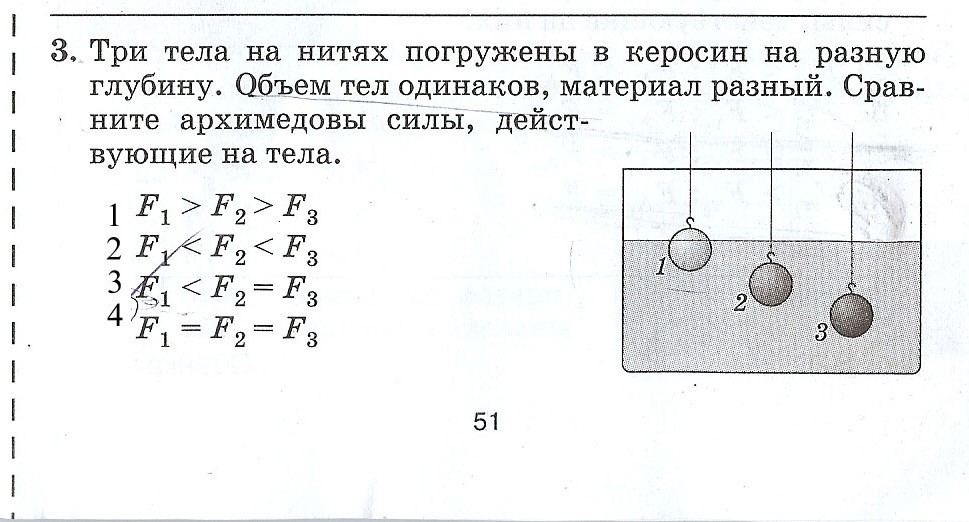 Все три тела находятся в равновесии, но первое тело погружено в жидкость не полностью, значит объем вытесненной им жидкости меньше.