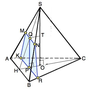 Плоскость сечения перпендикулярна АВС. Для её построения из середины Q отрезка MN опустим перпендикуляр QP на плоскость АВС.
