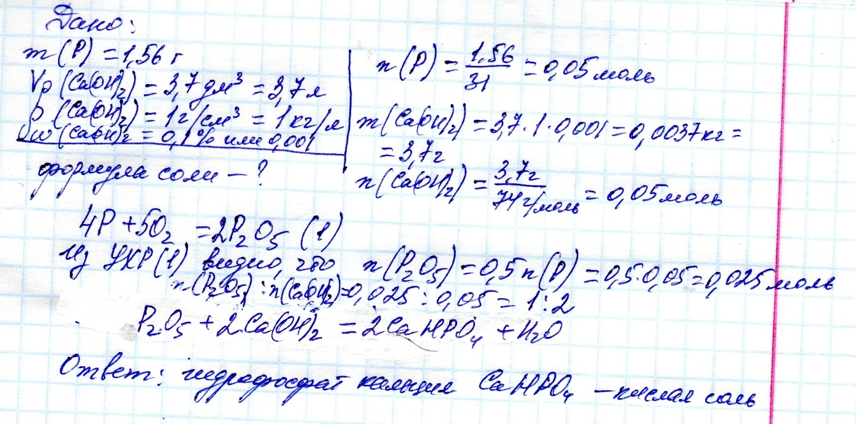 Сжигают 1,56 г фосфора на воздухе продукт вносят в 3.7 дм 3 0.1% р-ра гидроксида кальция-плотность 1г см3 Установите формулу образовавшейся соли