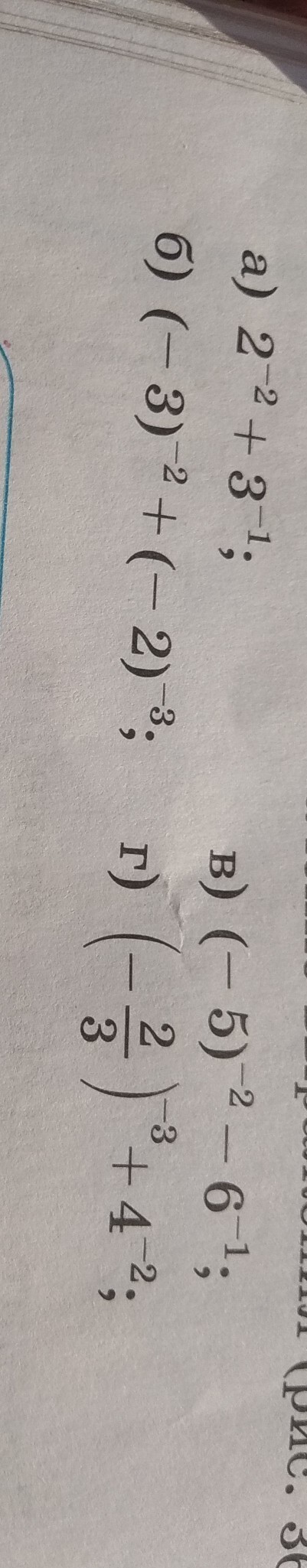 а) 2⁻² + 3⁻¹ = 1/2² + 1/3¹ = 1/4 + 1/3 = 3/12 + 4/12 = 7/12