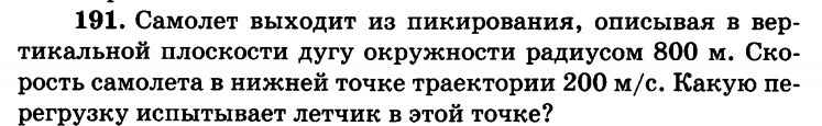 Самолёт выходит из пикирования, описывая в вертикальной плоскости дугу радиусом 800 метров. Скорость самолёта в нижней точке траектории 200 м/с. Какую перегрузку испытывает лётчик в нижней точке траектории?