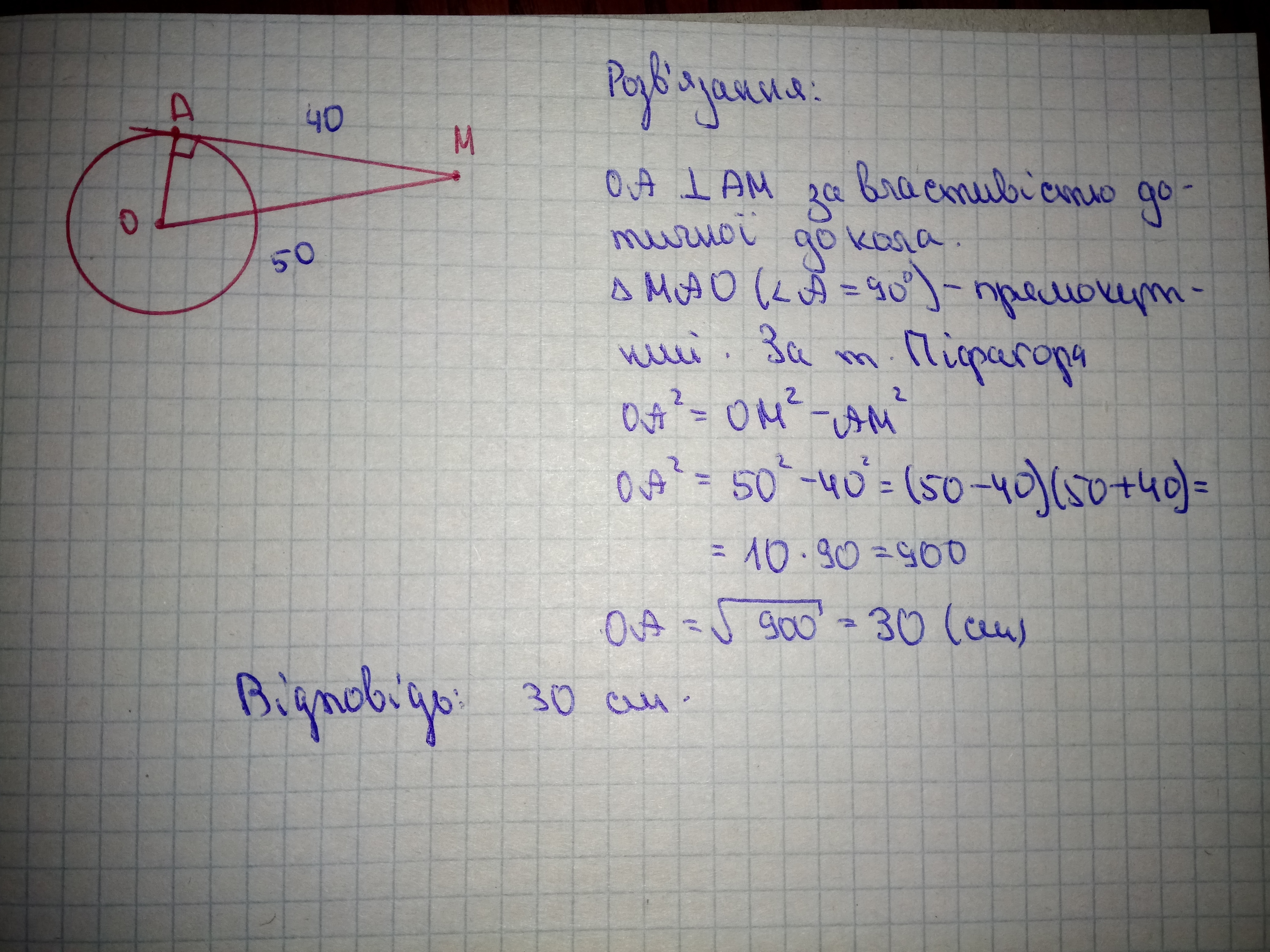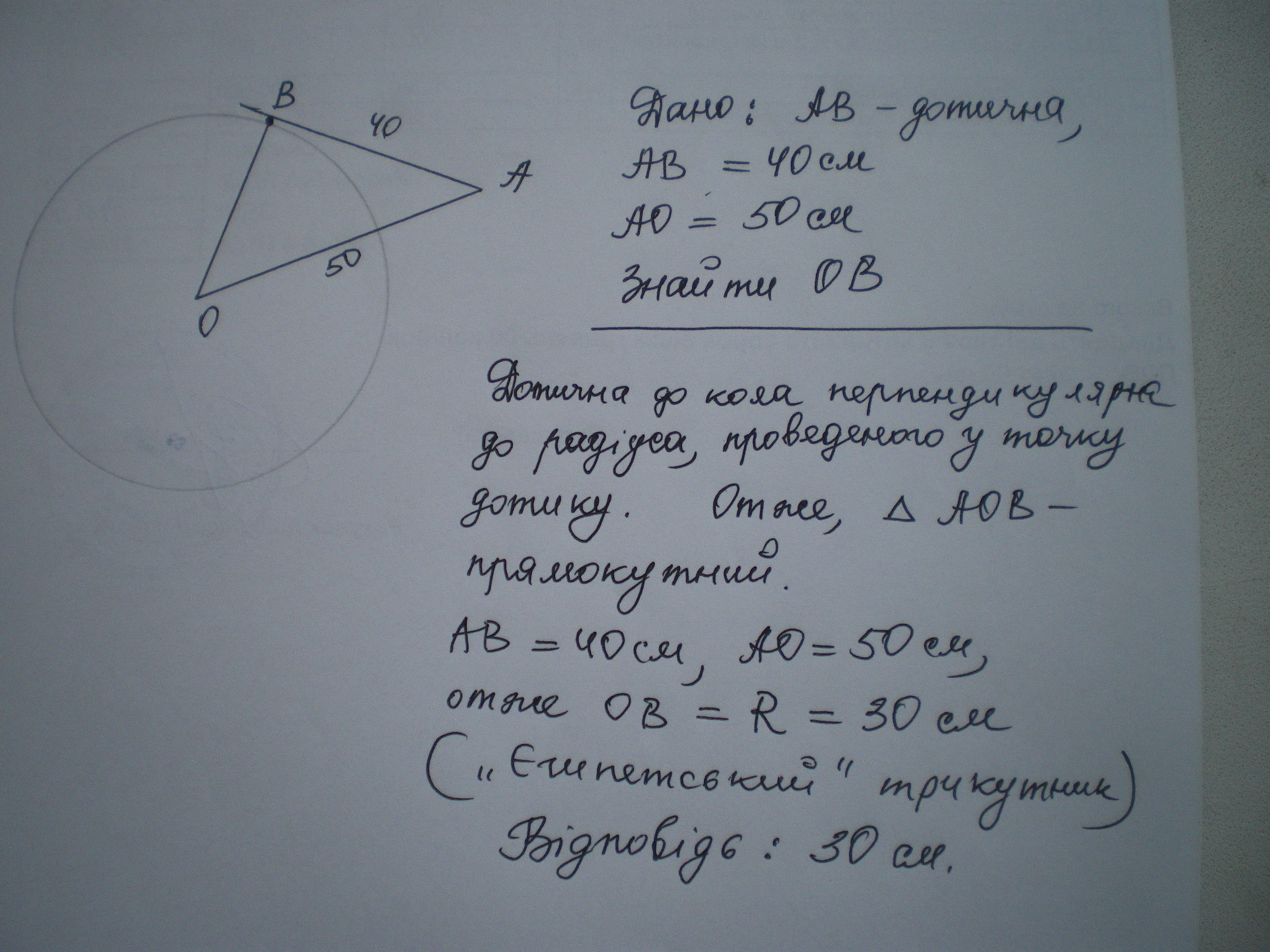 довжина дотичнои,що проведена з одниеи точки до кола 40см.