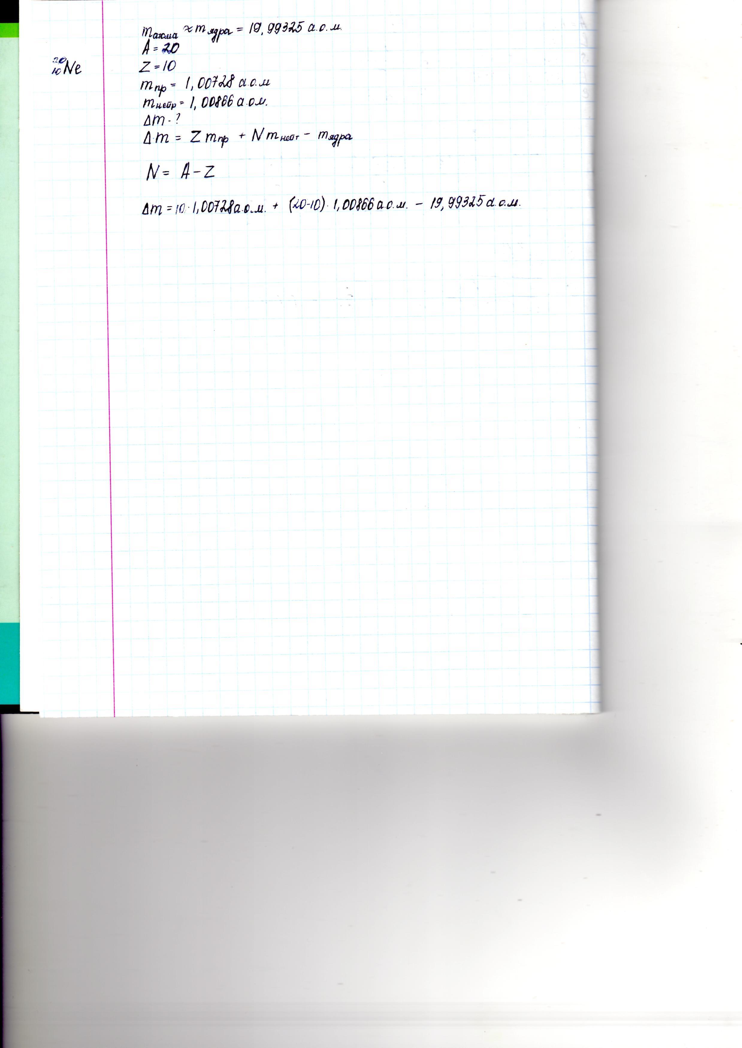 Помогите пожалуйста: Чему равняется дефект массы атома Неона.(масса атома 19,99325 а.о.м,масса электрона 0,00055 а.о.м,масса протона 1,00728 а.о.м,масса нейтрона 1,00866 а.о.м)