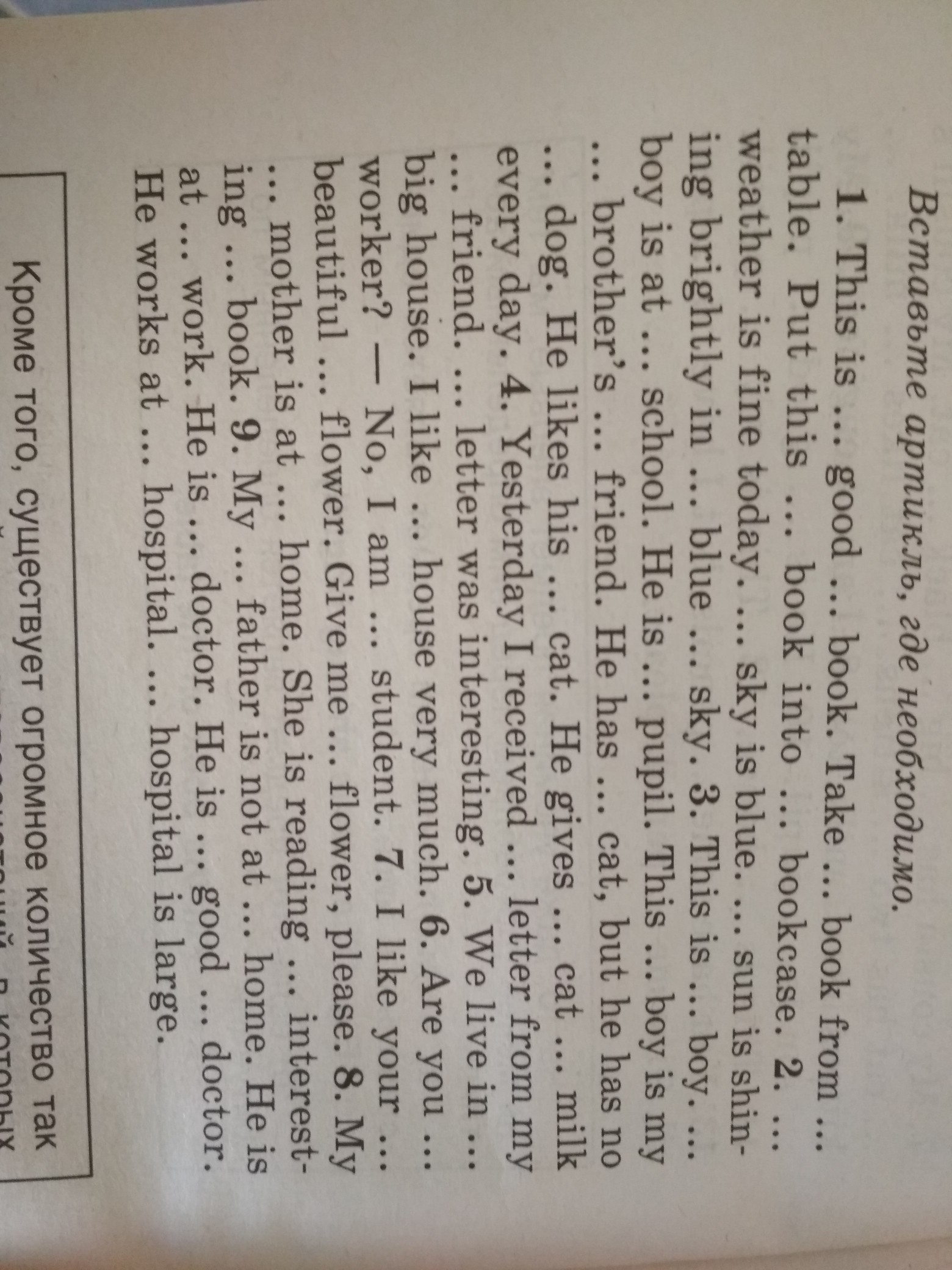 This is a good book. Take the book from the table. Put this book into the bookcase. The weather is fine today. The sky is blue. The sun is shining brightly in the blue sky. This is a boy. The boy is at school. He is a pupil. This boy is my brother's friend. He has a cat, but he has no dog. He likes his cat. He gives the cat milk every day. Yesterday I received a letter from my friend. The letter was interesting. We live in a big house. I like the house very much. Are you a worker? - No, I am a student. I like your beautiful flower. Give me the flower, please. My mother is at home. She is reading an interesting book. My father is not at home. He is at work. He is a doctor. He is a good doctor. He works at the hospital. The hospital is large.