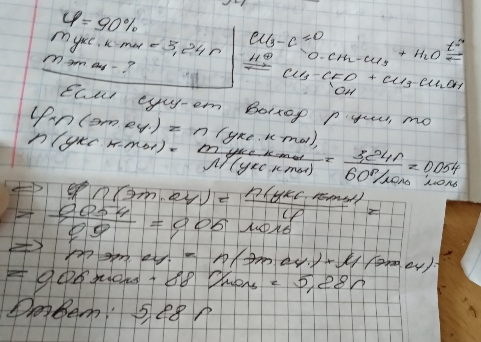 В результате гидролиза этилацетата с выходом 90% получили 3,24г уксусной кислоты. Масса этилацетата = ? г. Помогите пожалуйста