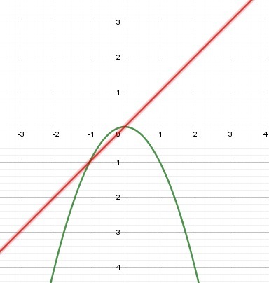 Рассмотрим график функции - парабола, ветви направлены вниз. и прямую y=x проходящую через начало координат: построим