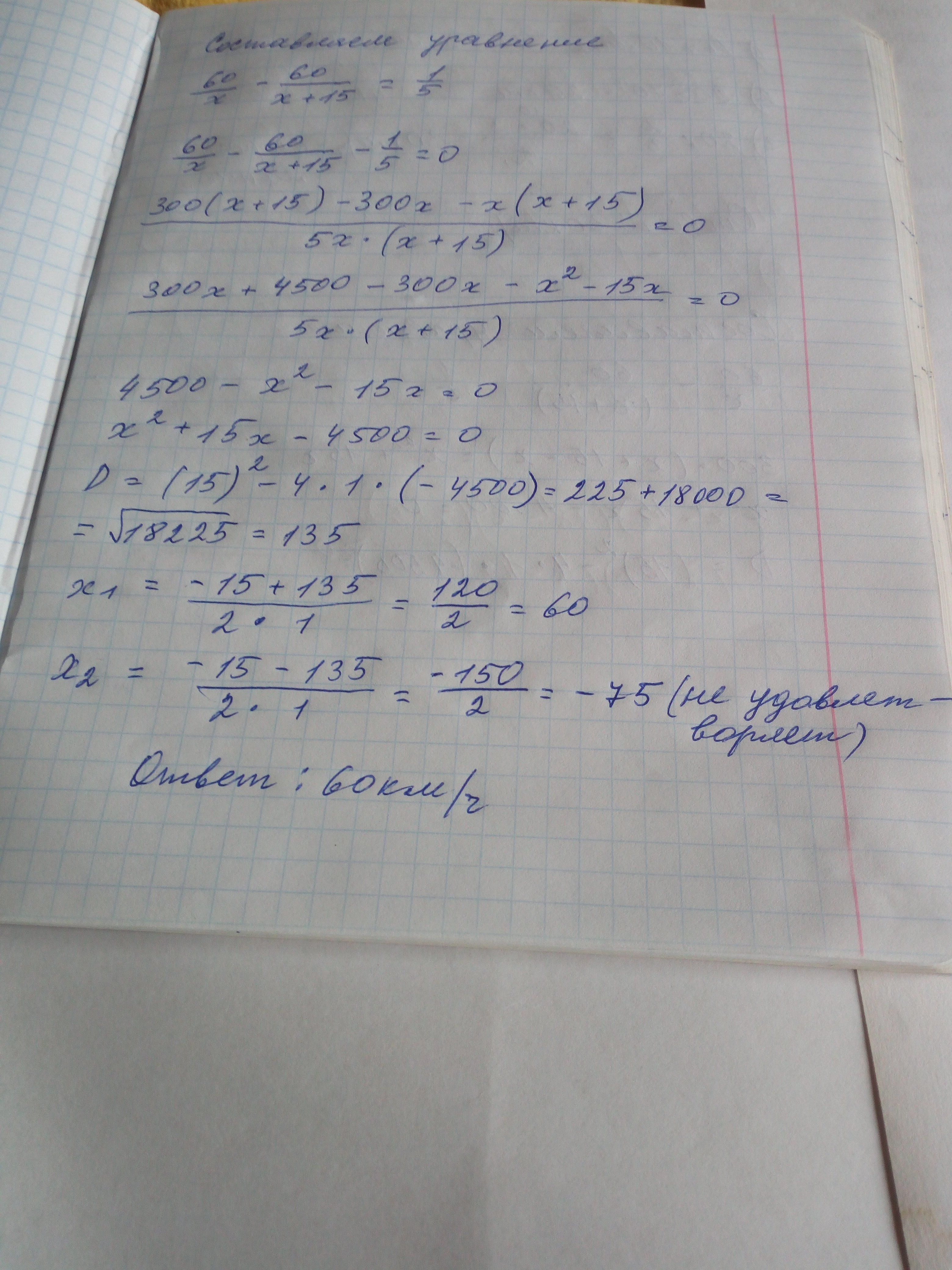 Пожалуйста,помогите решить задачу на движение!Товарный поезд был задержан в пути на 12 минут, а затем на расстоянии 60 км наверстал потерянное время, увеличив скорость на 15 км/ч. Найдите первоначальную скорость поезда.