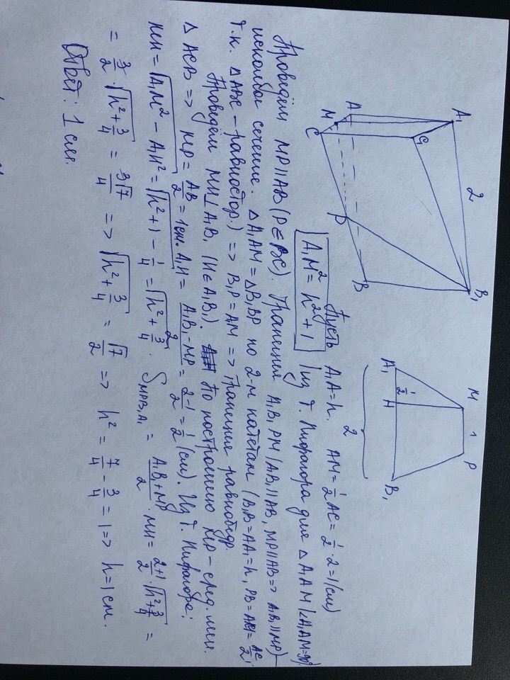 ABCA1B1C1 - Правильная треугольная призма. Через ребро А1В1 и точку М - середина АС - проведено сечение, площадь которого (3корень из семи)/4. Найдите высоту призмы, если сторона ее основания - 2 см