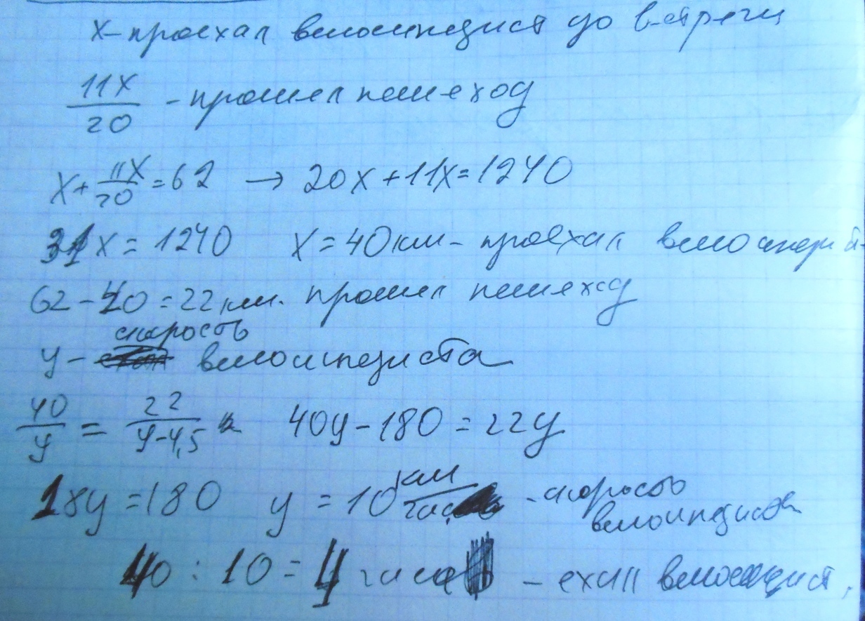 Велосипедист и пешеход одновременно отправились на встречу друг другу из двух пунктов , расстояние между которыми 62 км.при встрече оказалось что пройденный пешеходом путь составляет 11/20 пути ,проделанного велосипедистом . Сколько часов был в пути велосипедист до встречи с пешеходов,если его скорость была на 4,5 км/ч больше скорости пешехода?