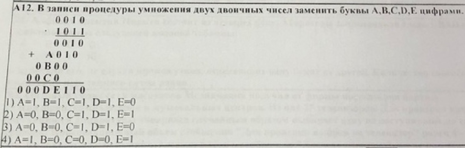 A = 0, B = 0, C = 1, D = 1, E = 0.