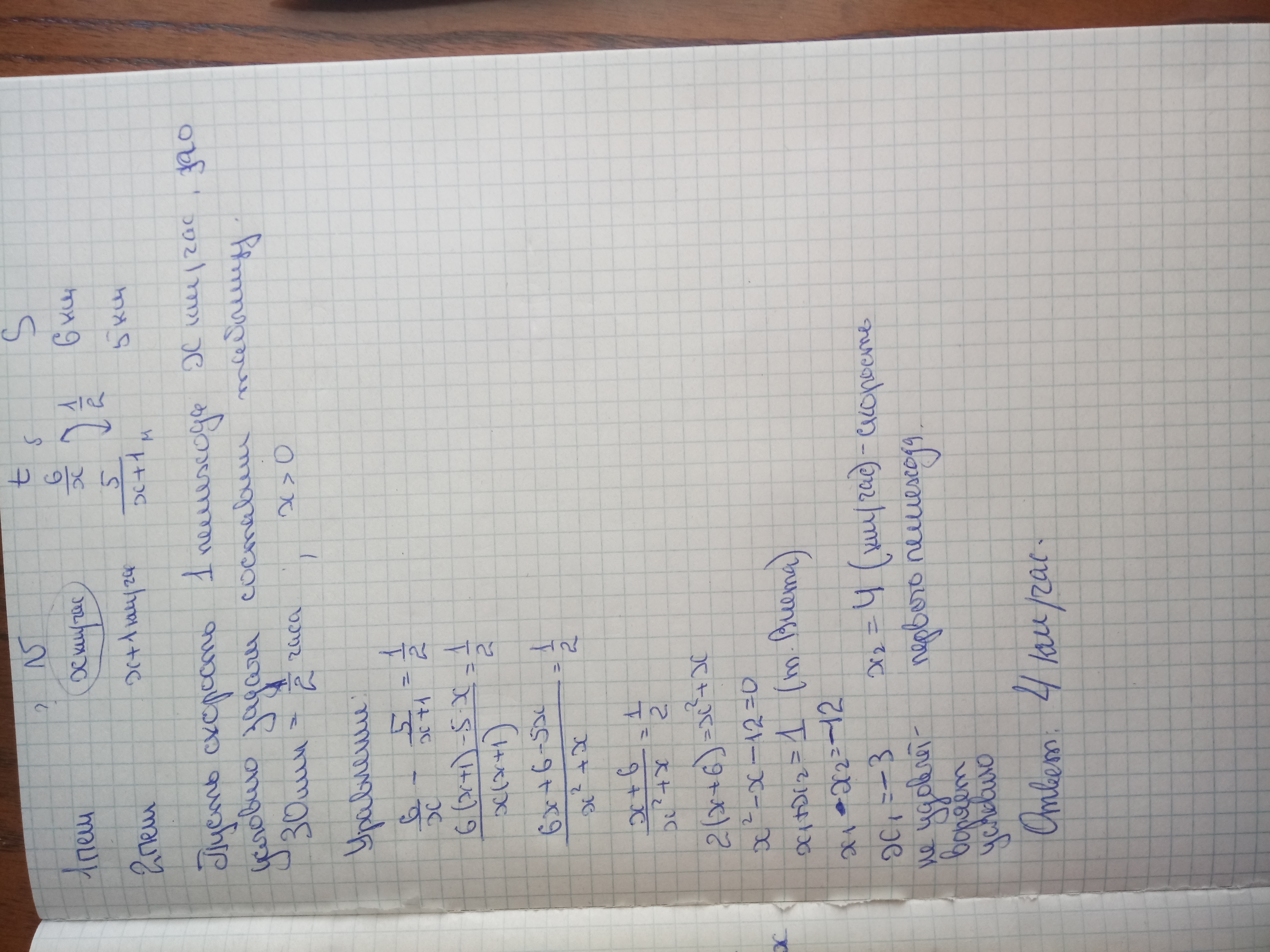 Первый пешеход прешёл 6 км, а второй пешеход 5 км. Скорость первого пешехода на 1 км/ч меньше, чем скорость второго. Найдите скорость первого пешехода, если известно, что он был в пути на 30 мин больше второго.