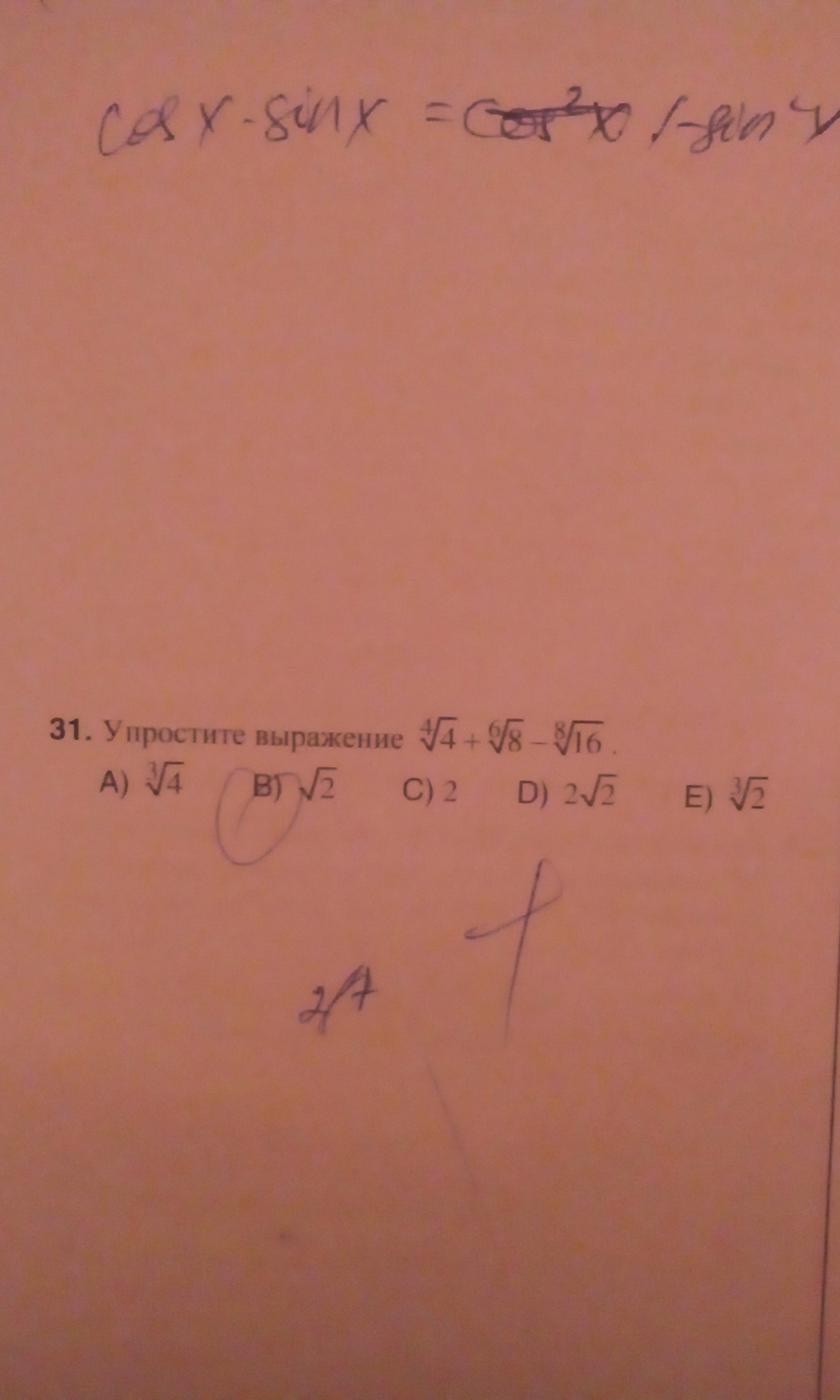 ![sqrt[4]{4} + sqrt[6]{8} - sqrt[8]{16} = {4}^{ frac{1}{4} } + {8}^{ frac{1}{6} } - {16}^{ frac{1}{8} } = {2}^{ frac{2}{4} } + {2}^{ frac{3}{6} } - {2}^{ frac{4}{8} } = {2}^{ frac{1}{2} } + {2}^{ frac{1}{2} } - {2}^{ frac{1}{2} } = sqrt{2} + sqrt{2} - sqrt{2} = sqrt{2} sqrt[4]{4} + sqrt[6]{8} - sqrt[8]{16} = {4}^{ frac{1}{4} } + {8}^{ frac{1}{6} } - {16}^{ frac{1}{8} } = {2}^{ frac{2}{4} } + {2}^{ frac{3}{6} } - {2}^{ frac{4}{8} } = {2}^{ frac{1}{2} } + {2}^{ frac{1}{2} } - {2}^{ frac{1}{2} } = sqrt{2} + sqrt{2} - sqrt{2} = sqrt{2}](https://tex.z-dn.net/?f=+sqrt%5B4%5D%7B4%7D++%2B++sqrt%5B6%5D%7B8%7D++-++sqrt%5B8%5D%7B16%7D++%3D+++%7B4%7D%5E%7B+frac%7B1%7D%7B4%7D+%7D++%2B++%7B8%7D%5E%7B+frac%7B1%7D%7B6%7D+%7D++-++%7B16%7D%5E%7B+frac%7B1%7D%7B8%7D+%7D++%3D++%7B2%7D%5E%7B+frac%7B2%7D%7B4%7D+%7D++%2B++%7B2%7D%5E%7B+frac%7B3%7D%7B6%7D+%7D++-++%7B2%7D%5E%7B+frac%7B4%7D%7B8%7D+%7D++%3D++%7B2%7D%5E%7B+frac%7B1%7D%7B2%7D+%7D++%2B++%7B2%7D%5E%7B+frac%7B1%7D%7B2%7D+%7D++-++%7B2%7D%5E%7B+frac%7B1%7D%7B2%7D+%7D++%3D++sqrt%7B2%7D++%2B++sqrt%7B2%7D++-++sqrt%7B2%7D++%3D++sqrt%7B2%7D+)