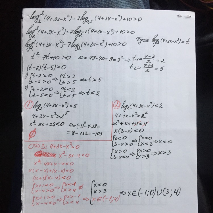 Log по основанию 2 в квадрате (4+3x-x в квадрате ) + 7 log по основанию 0,5 (4+3x-x в квадрате) + 10 >0